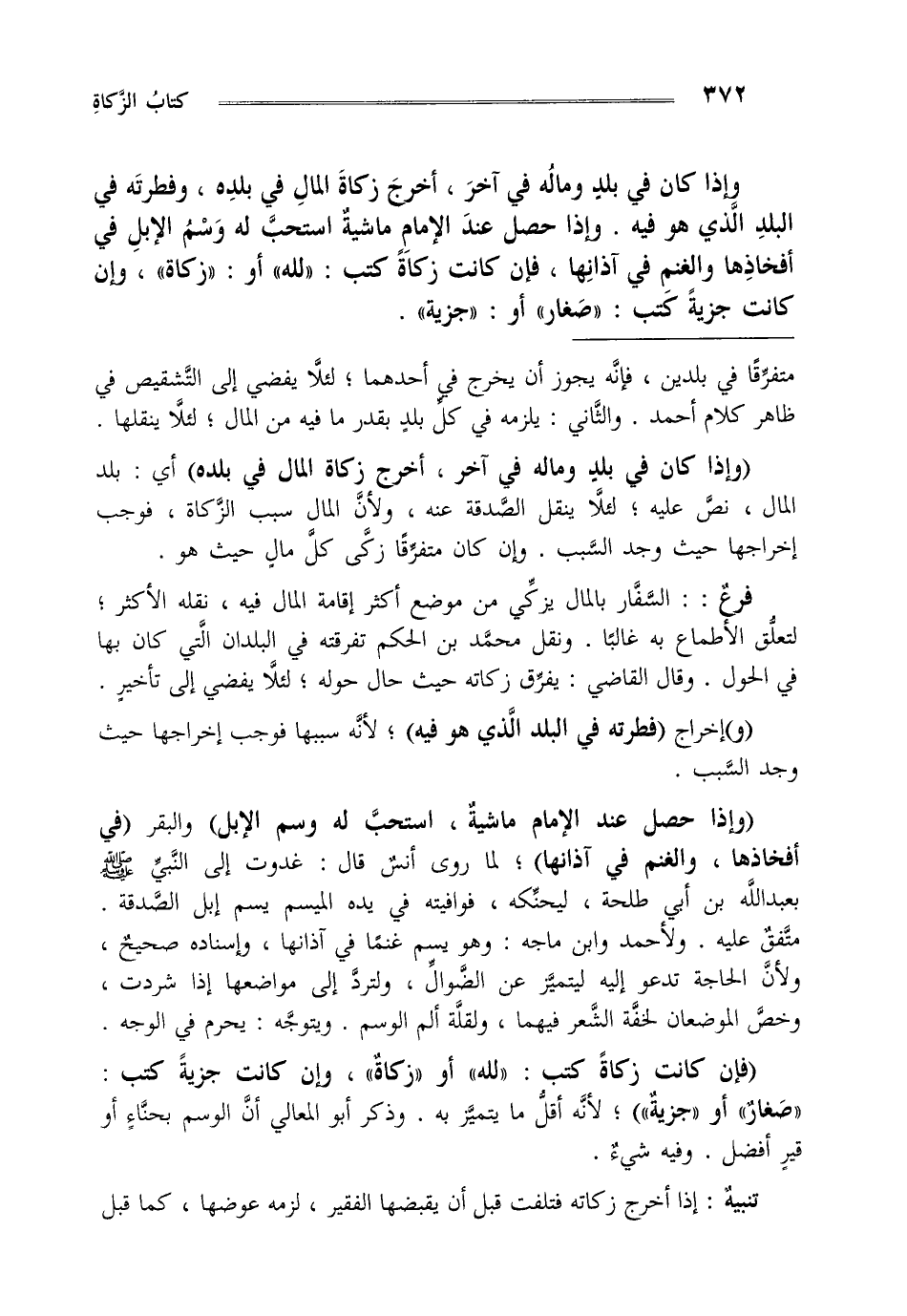 وإذا كان في بلد وماله في آخر ، أخرج زكاة المال في بلده ، وفطرته في البلد الذي هو فيه. وإذا حصل عند الإمام ماشية استحب له وسم الإبل في أفخاذها والغنم في آذانها ، فإن كانت زكاة كتب " لله " أو " زكاة " ، وإن كانت جزية كتب: " صغار " أو : " جزية ".
