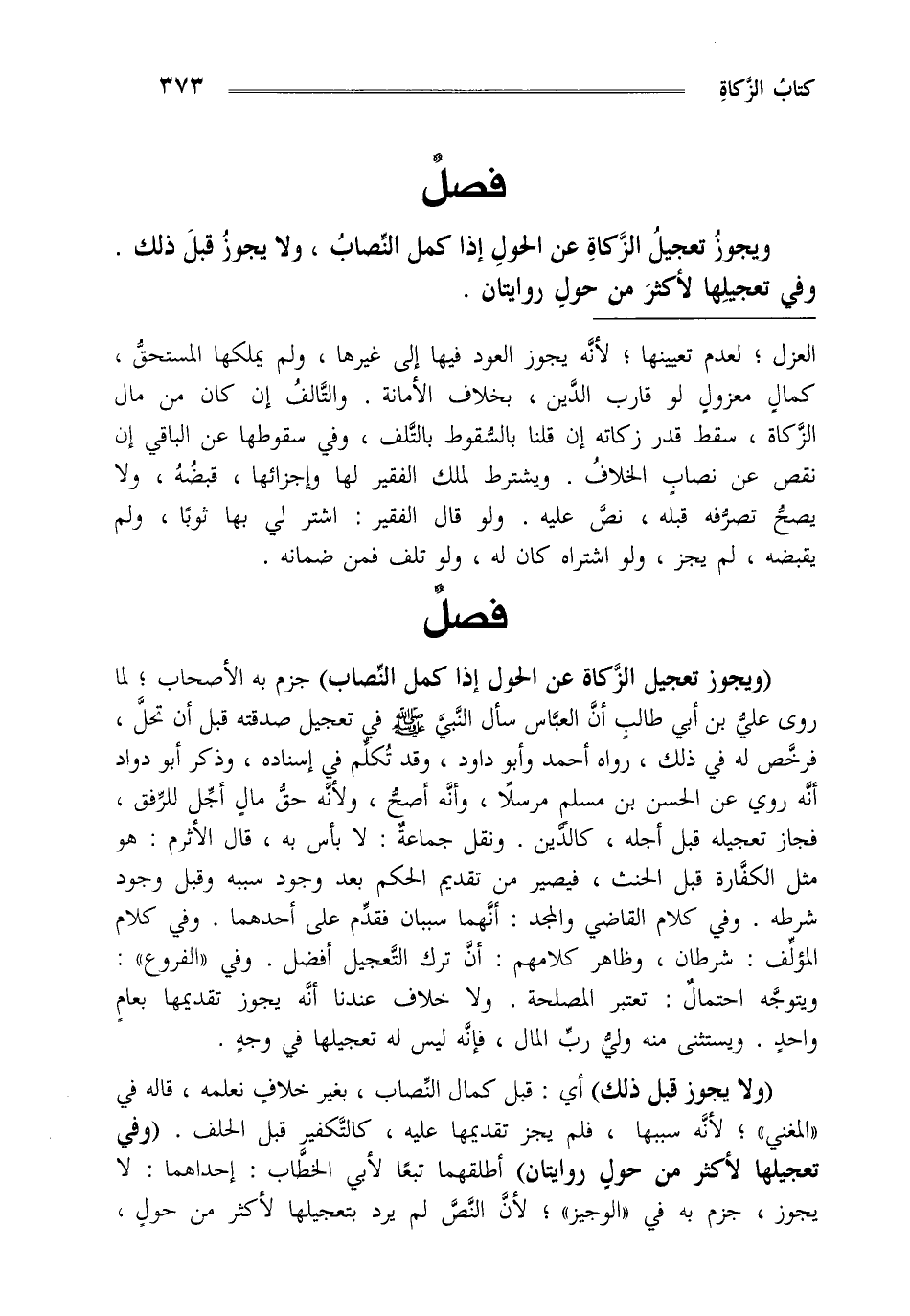 "ويجوز تعجيل الزكاة عن الحول إذا كمل النصاب" جزم به الأصحاب لما روى علي بن أبي طالب أن العباس سأل النبي صلى الله عليه وسلم في تعجيل صدقته قبل أن تحل فرخص له في ذلك رواه أحمد وأبو داود وقد تكلم في إسناده وذكر أبو داود أنه روي عن الحسن بن مسلم مرسلا وأنه أصح ولأنه حق مال أجل للرفق فجاز تعجيله قبل أجله كالدين ونقل جماعة لا بأس به قال الأثرم هو مثل الكفارة قبل الحنث فيصير من تقديم الحكم بعد وجود سببه وقبل وجود شرطه وفي كلام القاضي والمجد أنهما سببان فقدم على أحدهما وفي كلام المؤلف شرطان وظاهر كلامهم أن ترك التعجيل أفضل وفي الفروع ويتوجه احتمال تعتبر المصلحة ولا خلاف عندنا أنه يجوز تقديمها بعام واحد ويستثنى منه ولي رب المال فإنه ليس له تعجيلها في وجه.