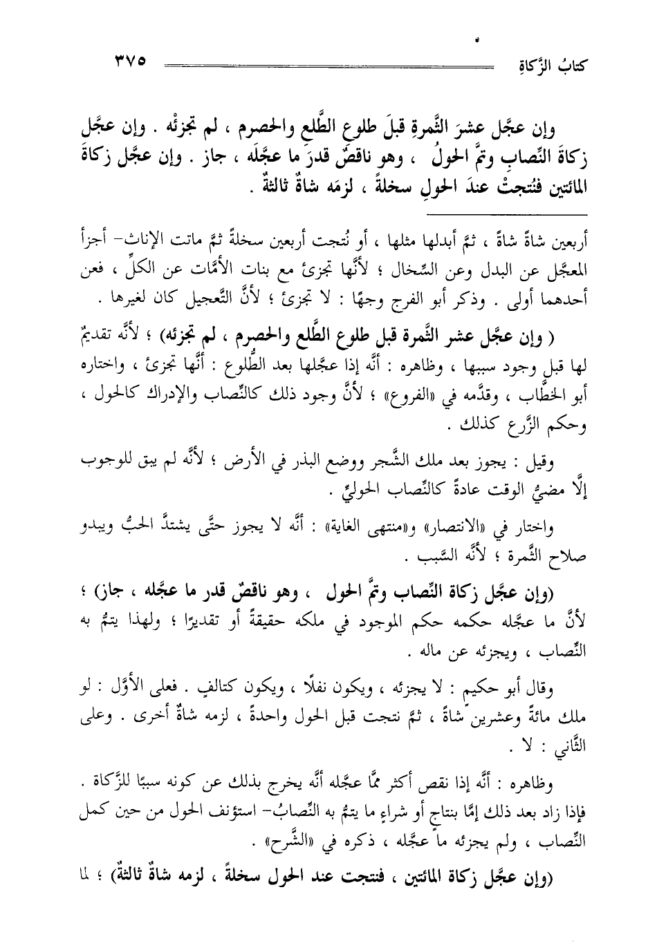وظاهره: أنه إذا نقص أكثر مما عجله أنه يخرج بذلك عن كونه سببا للزكاة فإذا زاد بعد ذلك إما بنتاج أو شراء ما يتم به النصاب استؤنف الحول من حين كمل النصاب ولم يجزئه ما عجله ذكره في الشرح.