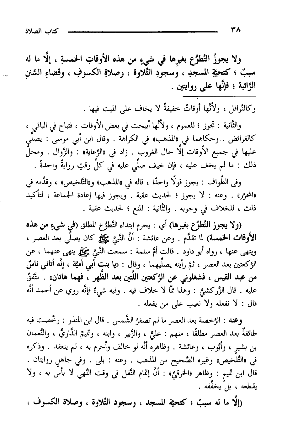 ولا يجوز التطوع بغيرها في شيء من هذه الأوقات الخمسة إلا ما له سبب كتحية المسجد وسجود التلاوة وصلاة الكسوف وقضاء السنن الراتبة فإنها على روايتين.
