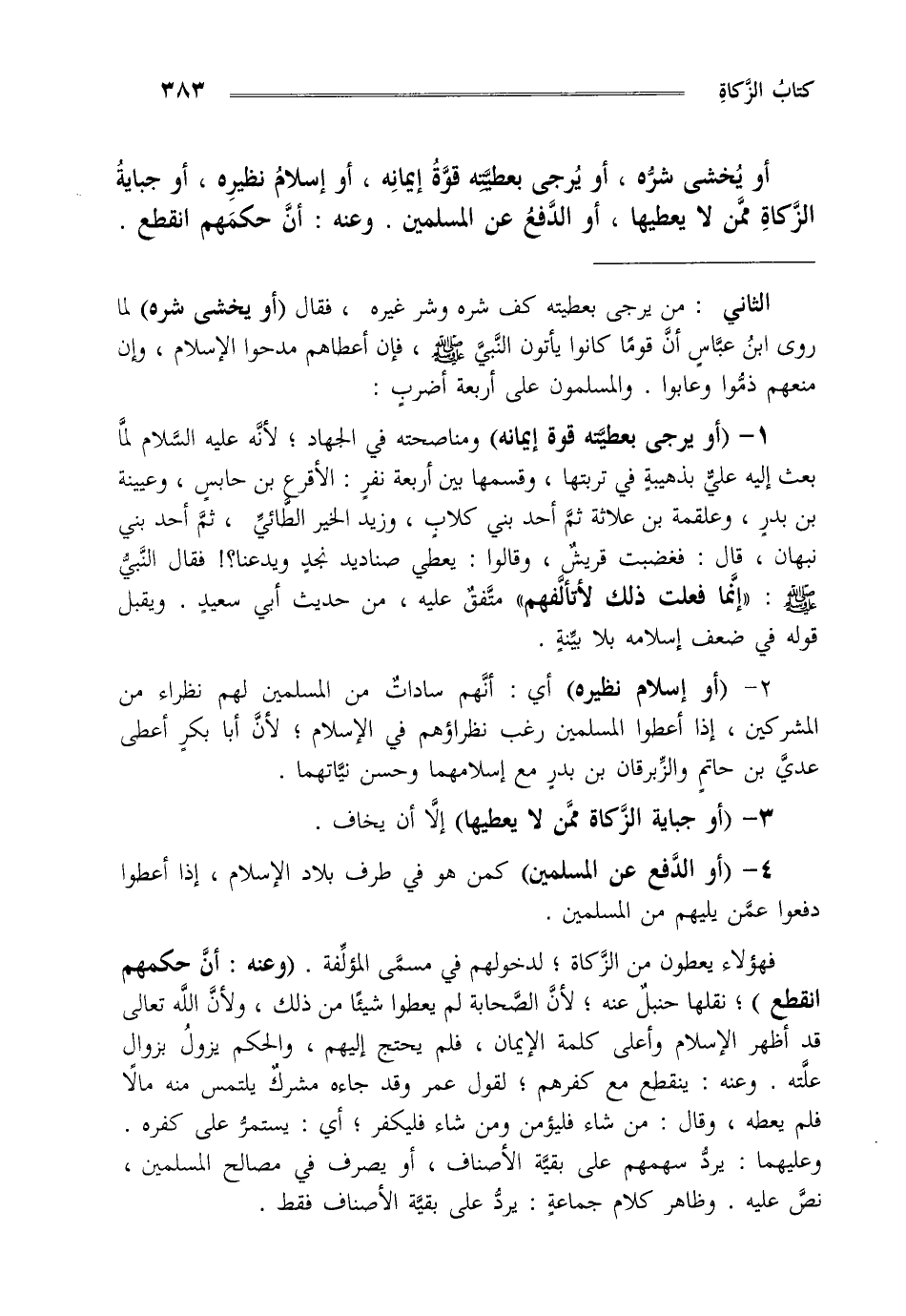 2- "أو إسلام نظيره" أي أنهم سادات من المسلمين لهم نظراء من المشركين إذا أعطوا المسلمين رغب نظراؤهم في الإسلام لأن أبا بكر أعطى عدي ابن حاتم والزبرقان بن بدر مع إسلامهما وحسن نياتهما.