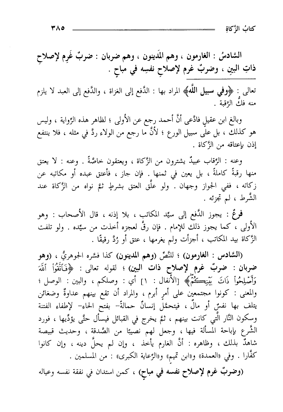 "السادس: الغارمون" للنص "وهم المدينون" كذا فسره الجوهري "وهو ضربان ضرب غرم لإصلاح ذات البين" لقوله تعالى {فَاتَّقُوا اللَّهَ وَأَصْلِحُوا ذَاتَ بَيْنِكُمْ} [لأنفال: من الآية1] أي وصلكم والبين الوصل والمعنى كونوا مجتمعين على أمر أبرم والمراد أن تقع بينهم عداوة وضغائن يتلف بها نفس أو مال فيتحمل إنسان حمالة بفتح الحاء لإطفاء الفتنة وسكون النار التي كانت بينهم ثم يخرج في القبائل فيسأل حتى يؤديها فورد الشرع بإباحة المسألة: فيها وجعل لهم نصيبا من الصدقة وحديث قبيصة شاهد بذلك وظاهره أن الغارم يأخذ وإن لم يحل دينه وإن كانوا كفارا وفي العمدة وابن تميم والرعاية الكبرى من المسلمين "وضرب غرم لإصلاح نفسه في مباح" كمن استدان في نفقة نفسه وعياله