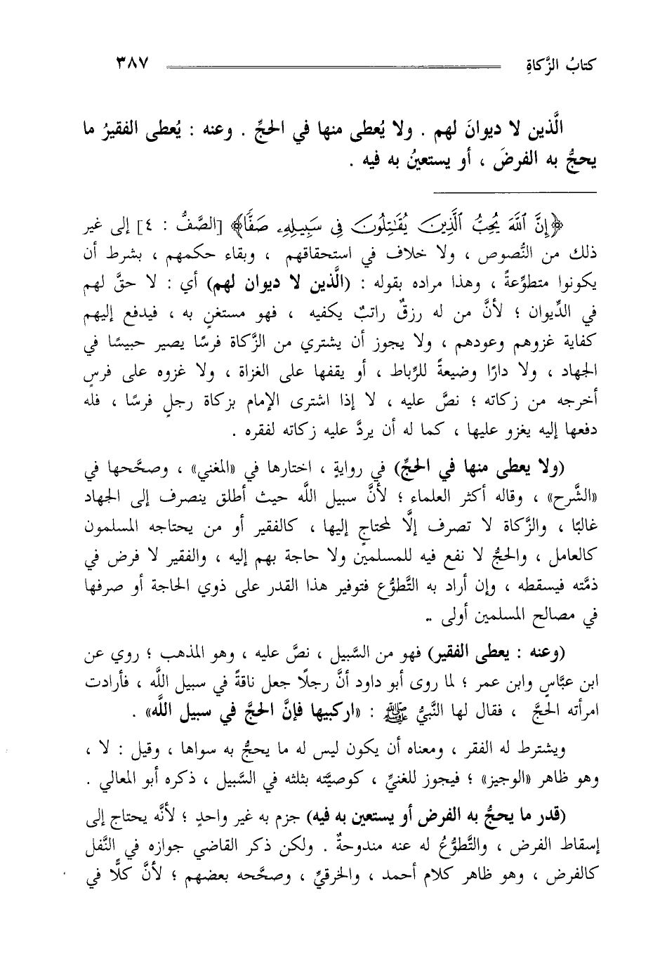 {إِنَّ اللَّهَ يُحِبُّ الَّذِينَ يُقَاتِلُونَ فِي سَبِيلِهِ صَفّاً} [الصف: من الآية4] إلى غير ذلك من النصوص ولا خلاف في استحقاقهم وبقاء حكمهم بشرط أن يكونوا متطوعة وهذا مراده بقوله "الذين لا ديوان لهم" أي لا حق لهم في الديوان لأن من له رزق راتب يكفيه فهو مستغن به فيدفع إليهم كفاية غزوهم وعودهم ولا يجوز أن يشتري من الزكاة فرسا يصير حبيسا في الجهاد ولا دارا وضيعة للرباط أو يقفها على الغزاة ولا غزوه على فرس أخرجه من زكاته نص عليه لا إذا اشترى الإمام بزكاة رجل فرسا فله دفعها إليه يغزو عليها كما له أن يرد عليه زكاته لفقره.