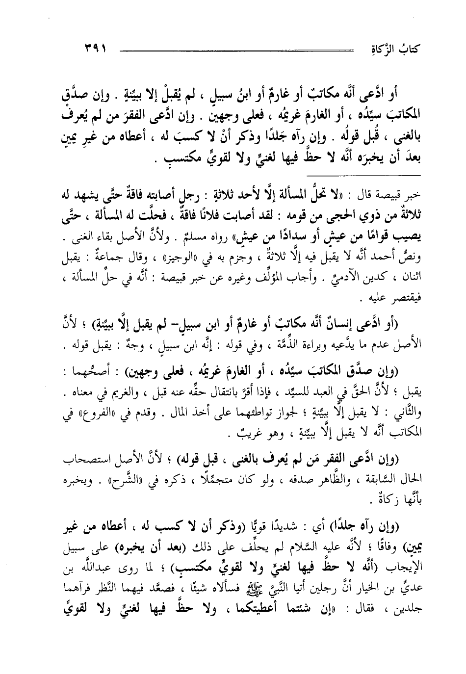 أو ادعى أنه مكاتب أو غارم أو ابن سبيل لم يقبل إلا ببينة وإن صدق المكاتب سيده أو الغارم غريمه فعلى وجهين وإن ادعى الفقر من لم يعرف بالغنى قبل قوله وإن رآه جلدا وذكر أن لا كسب له أعطاه من غير يمين بعد أن يخبره أنه لا حظ فيها لغني ولا لقوي مكتسب