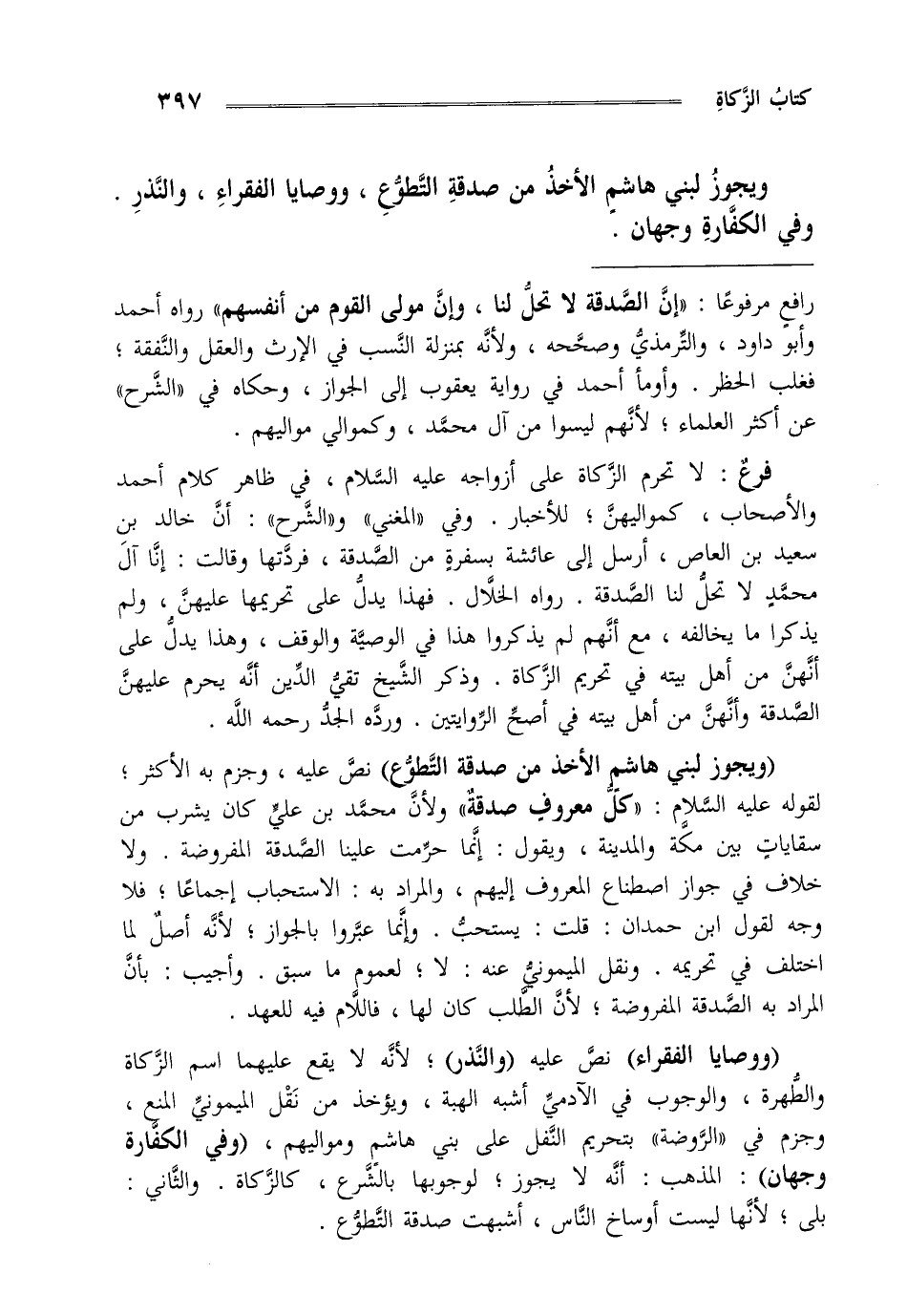 "ووصايا الفقراء" نص عليه "والنذر" لأنه لا يقع عليهما اسم الزكاة والطهرة والوجوب في الآدمي أشبه الهبة ويؤخذ من نقل الميموني المنع وجزم في الروضة بتحريم النفل على بني هاشم ومواليهم "وفي الكفارة" وجهان المذهب أنه لا يجوز لوجوبها بالشروع كالزكاة والثاني بلى لأنها ليست أوساخ الناس أشبهت صدقة التطوع.