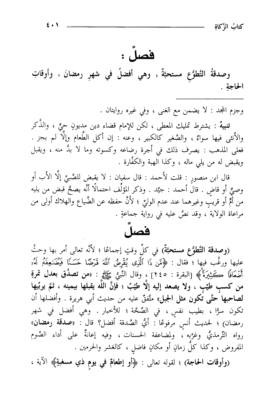 "وصدقة التطوع مستحبة" في كل وقت إجماعا لأنه تعالى أمر بها وحث عليها ورغب فيها فقال {مَنْ ذَا الَّذِي يُقْرِضُ اللَّهَ قَرْضاً حَسَناً فَيُضَاعِفَهُ لَهُ أَضْعَافاً كَثِيرَةً} [البقرة: من الآية245] وقال النبي صلى الله عليه وسلم "من تصدق بعدل تمرة من كسب طيب ولا يصعد إليه إلا طيب فإن الله يقبلها بيمينه ثم يربيها لصاحبها حتى تكون مثل الجبل" متفق عليه من حديث أبي هريرة وأفضلها أن تكون سرا بطيب نفس في الصحة للأخبار "وهي أفضل في شهر رمضان" لحديث أنس مرفوعا أي الصدقة أفضل قال "صدقة رمضان" رواه الترمذي وغربه ولمضاعفة الحسنات وفيه إعانة على أداء الصوم المفروض وكذا كل زمان أو مكان فاضل كالعشر والحرمين