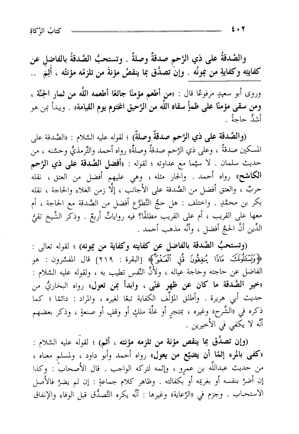 وروى أبو سعيد مرفوعا قال "من أطعم مؤمنا جائعا أطعمه الله من ثمار الجنة ومن سقى مؤمنا على ظمأ سقاه الله من الرحيق المختوم يوم القيامة" ويبدأ بمن هو أشد حاجة "والصدقة على ذي الرحم صدقة وصلة" لقوله عليه السلام "الصدقة على المسكين صدقة وعلى ذي الرحم صدقة وصلة" رواه أحمد والترمذي وحسنه من حديث سلمان لاسيما مع عداوته لقوله "أفضل الصدقة على ذي الرحم الكاشح" رواه أحمد والجار مثله وهي عليهم أفضل من العتق نقله حرب والعتق أفضل من الصدقة على الأجانب إلا زمن الغلاء والحاجة نقله بكر بن محمد واختلف هل حج التطوع أفضل من الصدقة مع الحاجة أم معها على القريب أم على القريب مطلقا فيه روايات أربع وذكر الشيخ تقي الدين أن الحج أفضل وأنه مذهب أحمد.