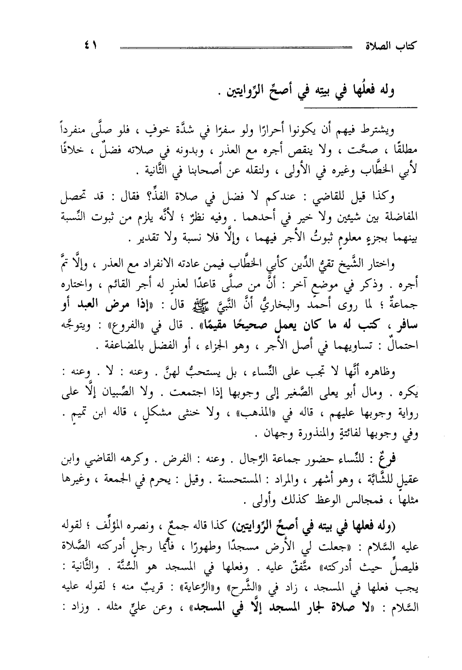 واختار الشيخ تقي الدين كأبي الخطاب فيمن عادته الانفراد مع العذر وإلا تم أجره وذكر في موضع آخر أن من صلى قاعدا لعذر له أجر القائم واختاره جماعة لما روى أحمد والبخاري أن النبي صلى الله عليه وسلم قال " إذا مرض العبد أو سافر كتب له ما كان يعمل صحيحا مقيما " قال في الفروع ويتوجه احتمال تساويهما في أصل الأجر وهو الجزاء أو الفضل بالمضاعفة.