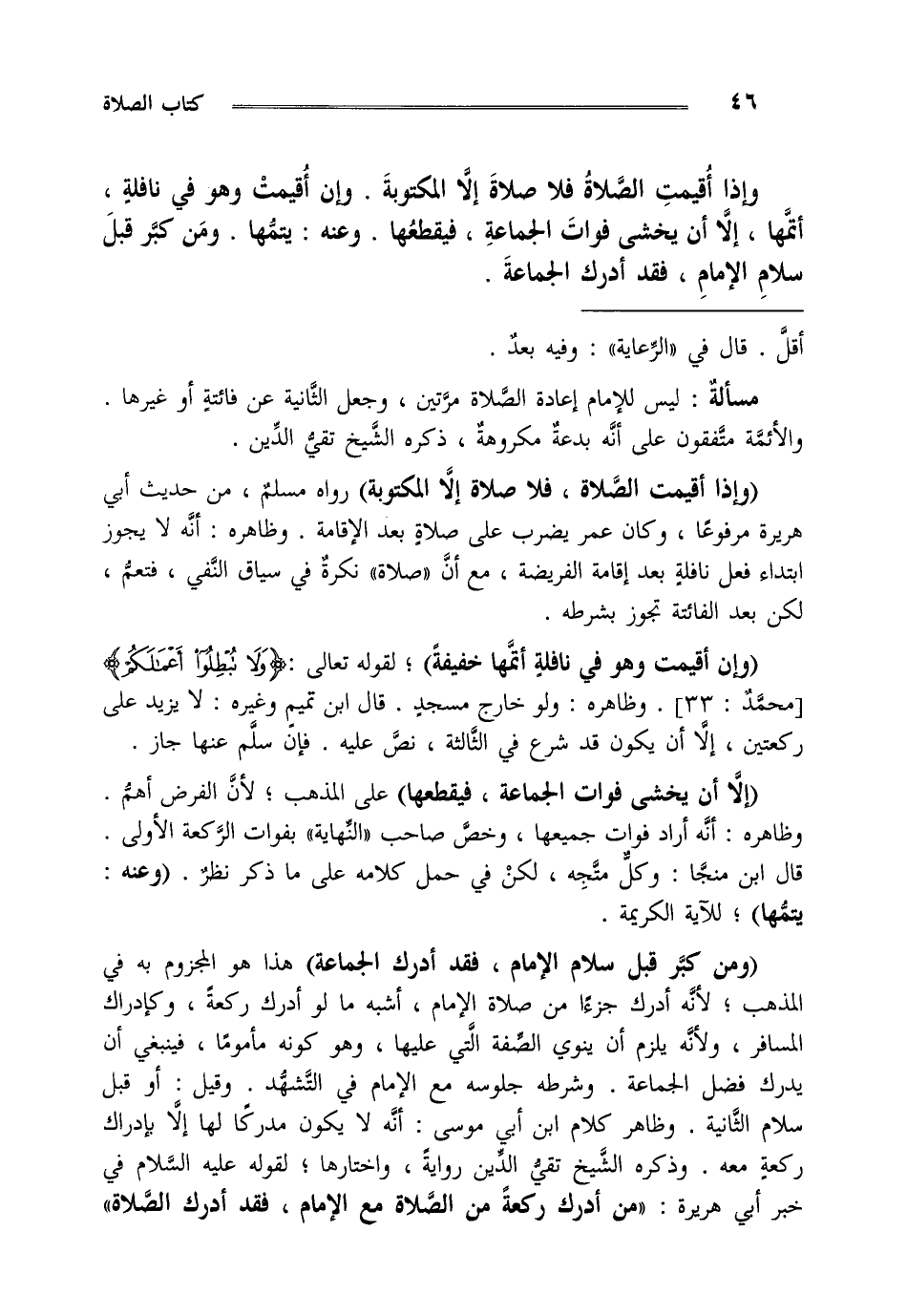"وإن أقيمت وهو في نافلة أتمها خفيفة" لقوله تعالى {وَلا تُبْطِلُوا أَعْمَالَكُمْ} [محمد: من الآية33] وظاهره ولو خارج مسجد قال ابن تميم وغيره لا يزيد على ركعتين إلا أن يكون قد شرع في الثالثة نص عليه فإن سلم عنها جاز "إلا أن يخشى فوات الجماعة فيقطعها" لأن الفرض أهم وظاهره أنه أراد وخص صاحب النهاية بفوات الركعة الأولى قال ابن منجا وكل متجه لكن في حمل كلامه على ما ذكر نظر "وعنه" يتمها للآية الكريمة.
