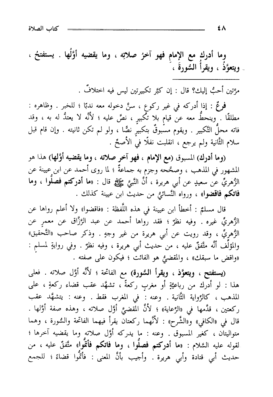 "وما أدرك" المسبوق "مع الإمام فهو آخر صلاته وما يقضيه أولها" هذا هو المشهور في المذهب وصححه وجزم به جماعة لما روى أحمد عن ابن عيينة عن الزهري عن سعيد عن أبي هريرة أن النبي صلى الله عليه وسلم قال " ما أدركتم فصلوا وما فاتكم فاقضوا " ورواه النسائي من حديث ابن عيينة كذلك