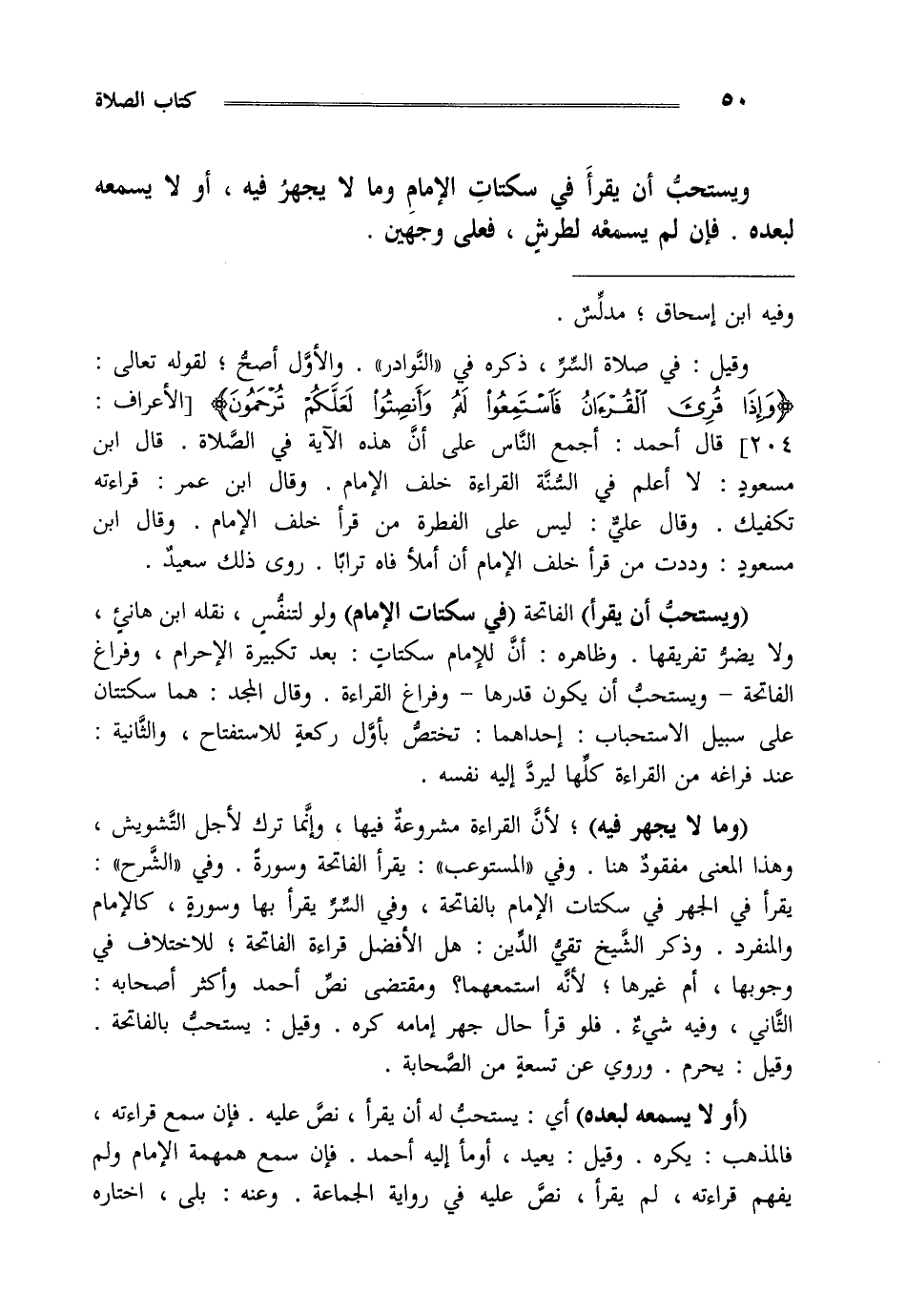 وقيل في صلاة السر ذكره في النوادر والأول أصح لقوله تعالى {وَإِذَا قُرِئَ الْقُرْآنُ فَاسْتَمِعُوا لَهُ وَأَنْصِتُوا لَعَلَّكُمْ تُرْحَمُونَ} [لأعراف:204] قال أحمد أجمع الناس على أن هذه الآية في الصلاة قال ابن مسعود لا أعلم في السنة القراءة خلف الإمام وقال ابن عمر قراءته تكفيك وقال علي ليس على الفطرة من قرأ خلف الإمام وقال ابن مسعود وددت من قرأ خلف الإمام أن أملأ فاه ترابا روى ذلك سعيد.
