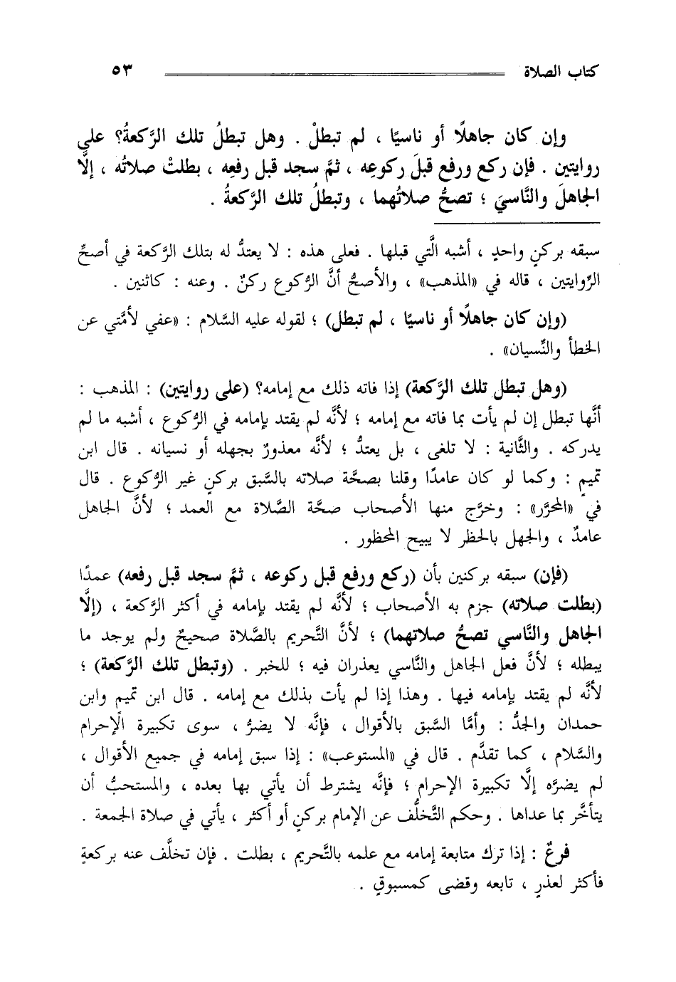 "وإن كان جاهلا أو ناسيا لم تبطل" لقوله عليه السلام " عفي لأمتي عن الخطأ والنسيان " "وهل تبطل تلك الركعة" إذا فاته ذلك مع إمامه على روايتين المذهب أنها تبطل إن لم يأت بما فاته مع إمامه لأنه لم يقتد بإمامه في الركوع أشبه ما لم يدركه والثانية لا تلغى بل يعتد لأنه معذور بجهله أو نسيانه قال ابن تميم وكما لو كان عامدا وقلنا بصحة صلاته بالسبق بركن غير الركوع قال في المحرر وخرج منها الأصحاب صحة الصلاة مع العمد لأن الجاهل عامد والجهل بالحظر لا يبيح المحظور.
