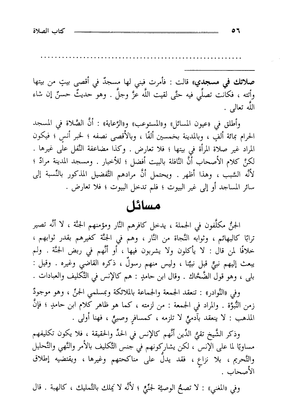 الجن مكلفون في الجملة يدخل كافرهم النار ومؤمنهم الجنة لا أنه يصير ترابا كالبهائم وثوابه النجاة من النار وهم في الجنة كغيرهم بقدر ثوابهم خلافا لمن قال لا يأكلون ولا يشربون فيها أو أنهم في ربض الجنة ولم يبعث إليهم نبي قبل نبينا وليس منهم رسول ذكره القاضي وغيره وقيل بلى وهو قول الضحاك وقال ابن حامد هم كالإنس في التكليف والعبادات وفي النوادر تنعقد الجمعة والجماعة بالملائكة وبمسلمي الجن وهو موجود زمن النبوة والمراد في الجمعة من لزمته كما هو ظاهر كلام ابن حامد فإن المذهب لا ينعقد بآدمي لا تلزمه كمسافر وصبي فهنا أولى