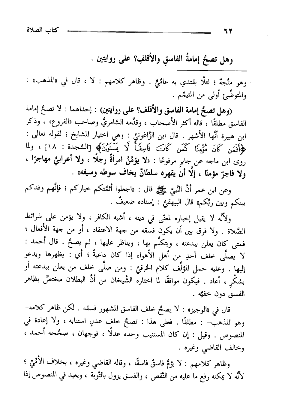 "وهل تصح إمامة الفاسق والأقلف على روايتين" إحداهما لا تصح إمامة الفاسق مطلقا قاله أكثر الأصحاب وقدمه السامري وصاحب الفروع وذكر ابن هبيرة أنها الأشهر قال ابن الزاغوني وهي اختيار المشايخ لقوله تعالى {أَفَمَنْ كَانَ مُؤْمِناً كَمَنْ كَانَ فَاسِقاً لا يَسْتَوُونَ} [السجدة:18] ولما روى ابن ماجه عن جابر مرفوعا "لا يؤمن امرأة رجلا ولا أعرابي مهاجرا ولا فاجر مؤمنا إلا أن يقهره سلطان يخاف سوطه وسيفه"