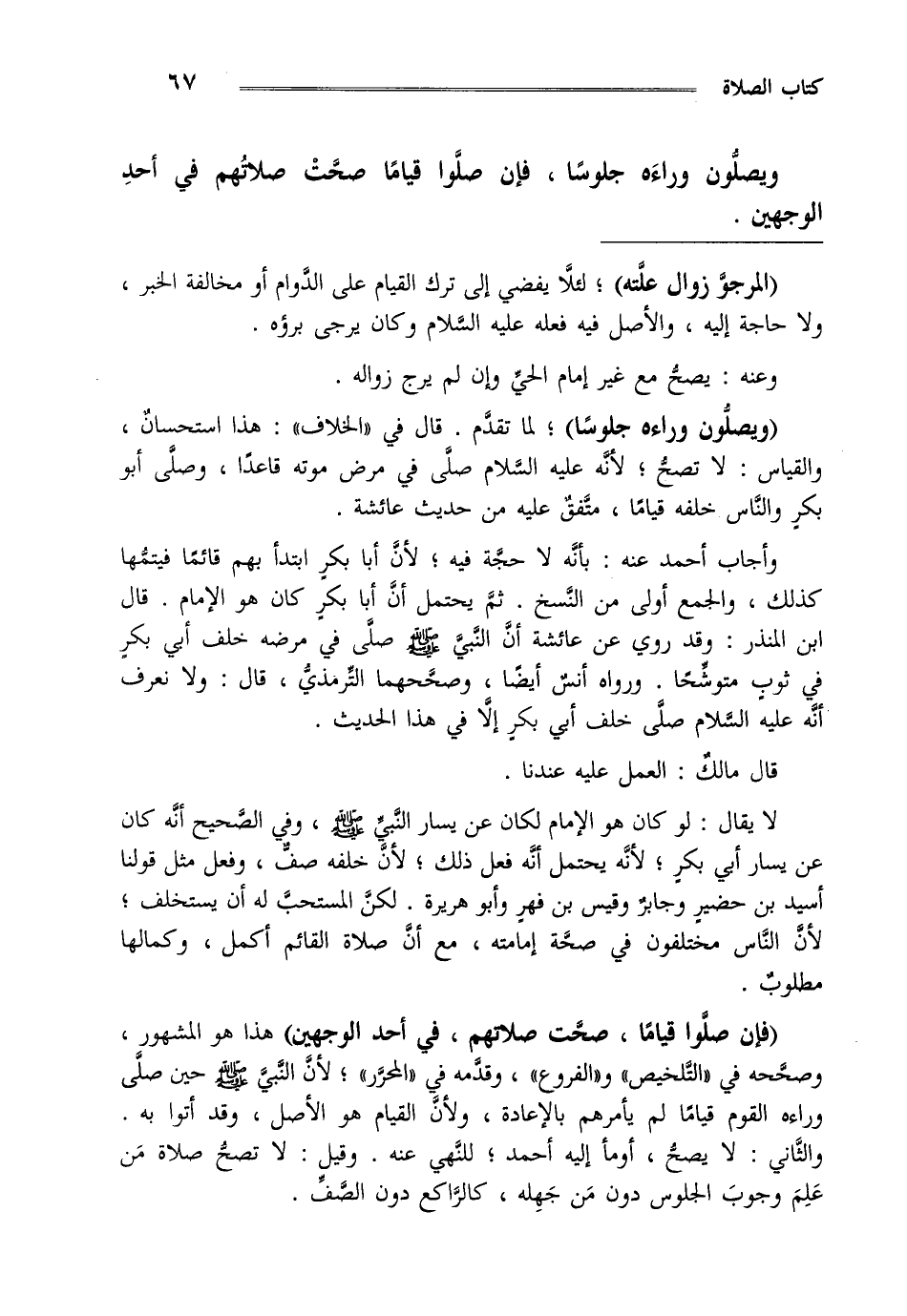 لا يقال لو كان هو الإمام لكان عن يسار النبي صلى الله عليه وسلم وفي الصحيح أنه كان عن يسار أبي بكر لأنه يحتمل أنه فعل ذلك لأن خلفه صف وفعل مثل قولنا أسيد بن حضير وجابر وقيس بن فهر وأبو هريرة لكن المستحب له أن يستخلف لأن الناس مختلفون في صحة إمامته مع أن صلاة القائم أكمل وكمالها مطلوب