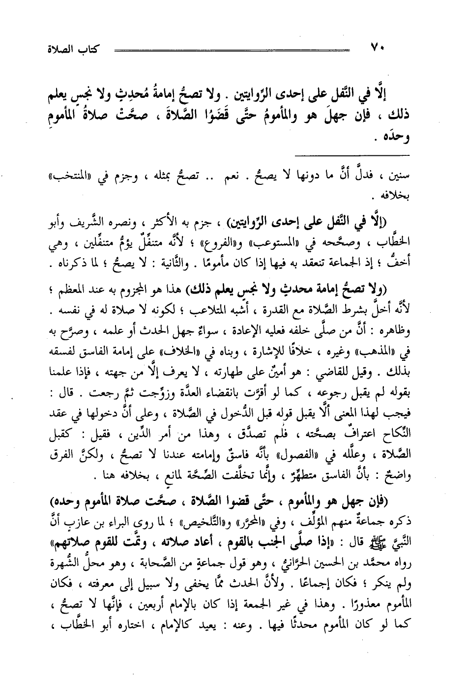 إلا في النفل على إحدى الروايتين ولا تصح إمامة محدث ولا نجس يعلم ذلك فإن جهل هو والمأموم حتى قضوا الصلاة صحت صلاة المأموم وحده.
