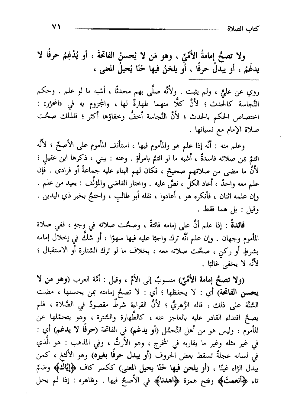 ولا تصح إمامة الأمي وهو من لا يحسن الفاتحة وهو يدغم حرفا لا يدغم وهو يبدل حرفا أو يلحن فيها لحنا يحيل المعنى.