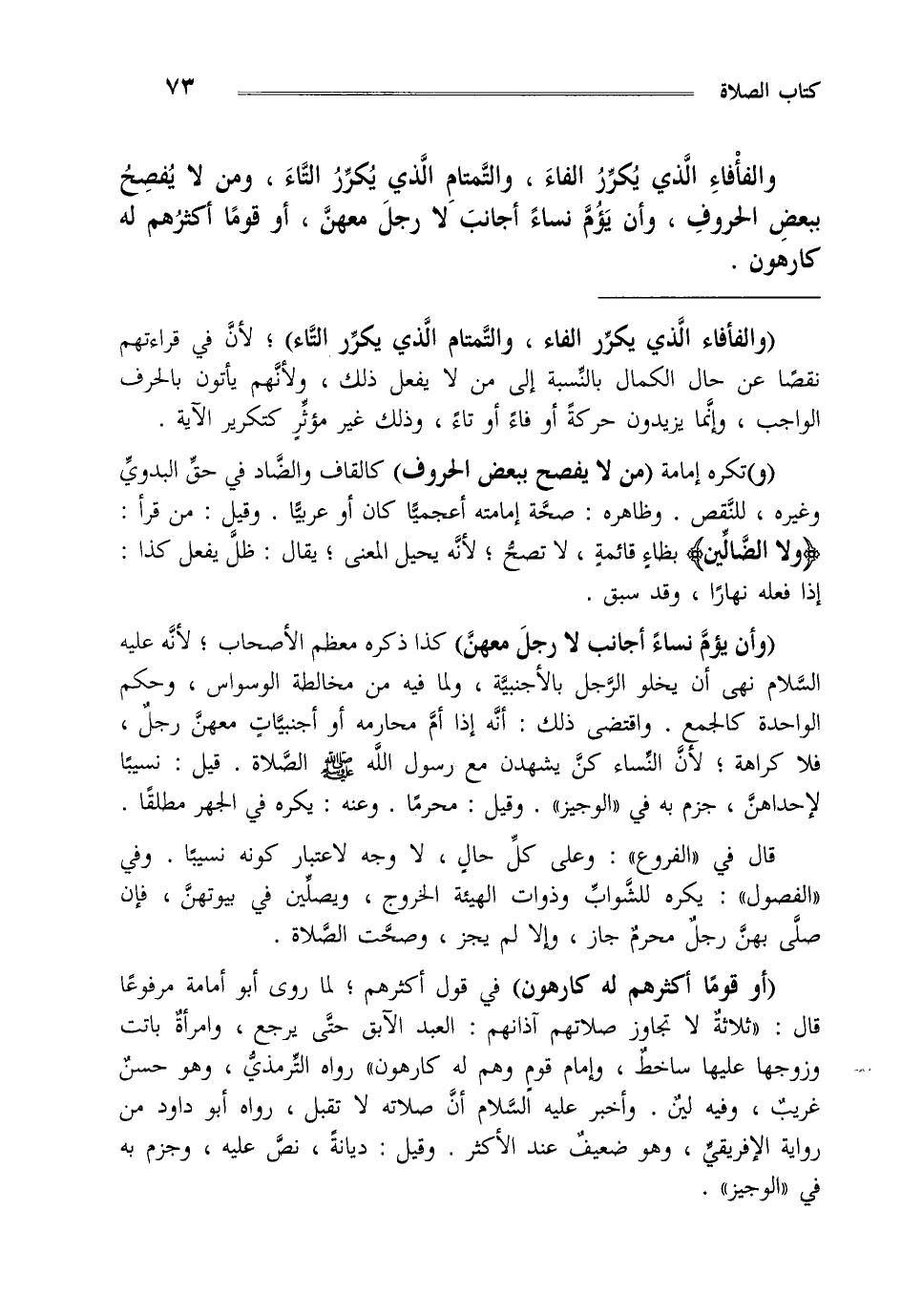 والفأفاء الذي يكرر الفاء والتمتام الذي يكرر التاء ومن لا يفصح ببعض الحروف وأن يؤم نساء أجانب لا رجل معهن أو قوما أكثرهم له كارهون.