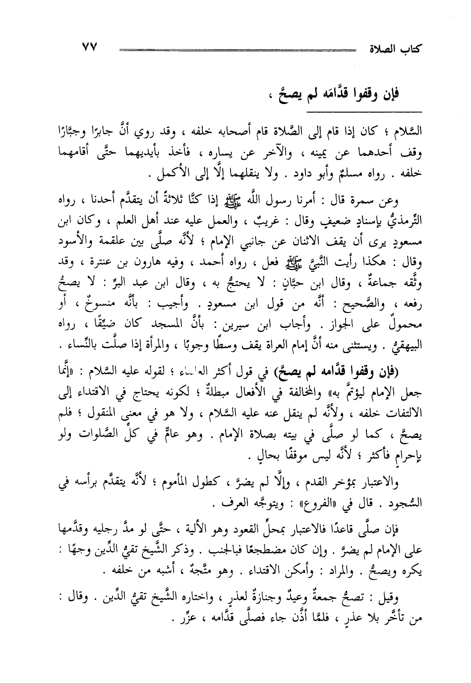 وعن سمرة قال أمرنا رسول الله صلى الله عليه وسلم إذا كنا ثلاثة أن يتقدم أحدنا رواه الترمذي بإسناد ضعيف وقال: غريب والعمل عليه عند أهل العلم وكان ابن مسعود يرى أن يقف الاثنان عن جانبي الإمام لأنه صلى بين علقمة والأسود وقال هكذا رأيت النبي صلى الله عليه وسلم فعل رواه أحمد وفيه هارون بن عنترة وقد وثقه جماعة وقال ابن حبان لا يحتج به وقال ابن عبد البر لا يصح رفعه والصحيح أنه من قول ابن مسعود وأجيب بأنه منسوخ أو على الجواز وأجاب ابن سيرين بأن المسجد كان ضيقا رواه البيهقي ويستثنى منه أن إمام العراة يقف وسطا وجوبا والمرأة إذا صلت بالنساء.