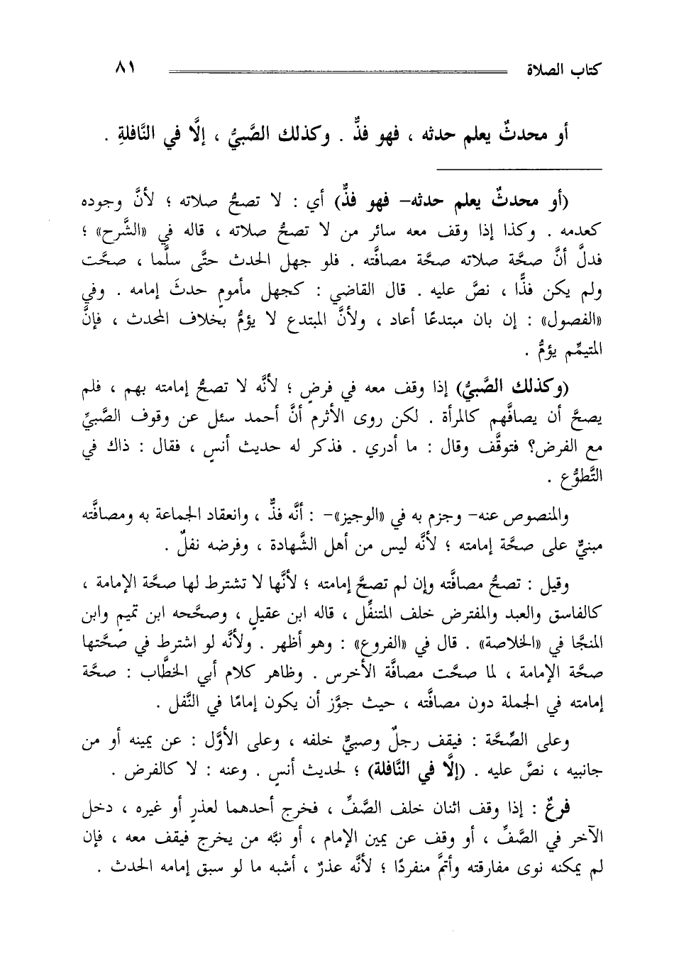 أو محدث يعلم حدثه فهو فذ ، وكذلك الصبي إلا في النافلة.