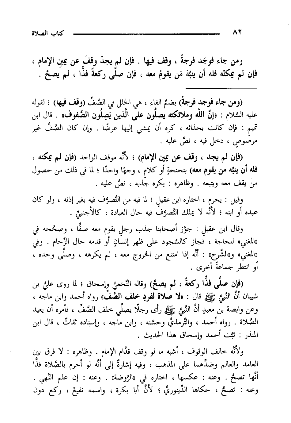 ولأنه خالف الوقوف أشبه ما لو وقف قدام الإمام وظاهره لا فرق بين العامد والعالم وضدهما على المذهب وفيه إشارة إلى أنه لو أحرم بالصلاة فذا أنها تصح وعنه عكسها اختاره في الروضة وعنه إن علم النهي وعنه تصح حكاها الدينوري لأن أبا بكرة واسمه نفيع ركع دون