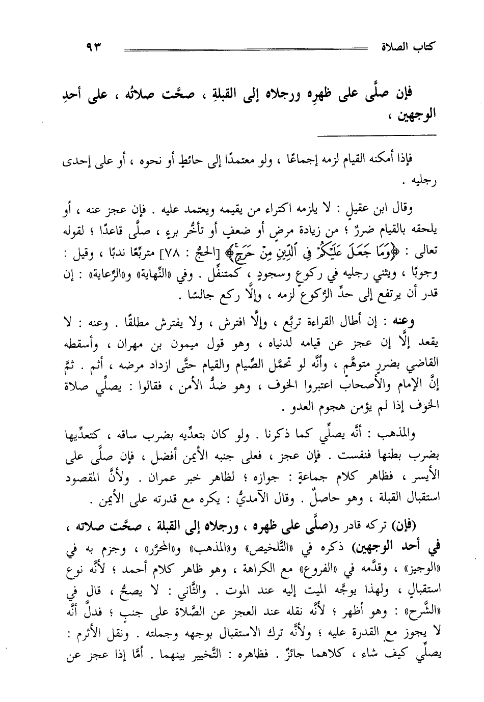 "فإن" تركه قادر و "صلى على ظهره ورجلاه إلى القبلة صحت صلاته في أحد الوجهين" ذكره في التلخيص والمذهب والمحرر وجزم به في الوجيز وقدمه في الفروع مع الكراهة وهو ظاهر كلام أحمد لأنه نوع استقبال ولهذا يوجه الميت إليه عند الموت والثاني لا يصح قال في الشرح وهو أظهر ولأنه نقله عند العجز عن صلاة على جنب فدل أنه لا يجوز مع القدرة عليه لأنه ترك الاستقبال بوجهه و جملته ونقل الأثرم يصلي كيف شاء كلاهما جائز فظاهره التخيير بينهما أما إذا عجز عن.