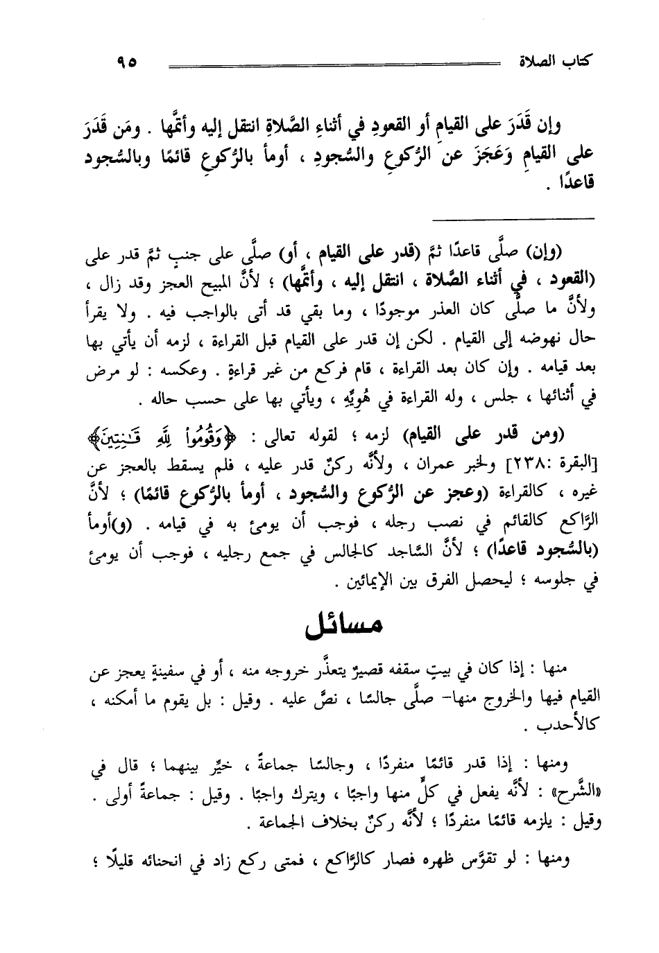 "ومن قدر على القيام" لزمه لقوله تعالى {وَقُومُوا لِلَّهِ قَانِتِينَ} [البقرة: من الآية238] ولخبر عمران ولأنه ركن قدر عليه فلم يسقط بالعجز عن غيره كالقراءة "وعجز عن الركوع والسجود أومأ بالركوع قائما" لأن الراكع كالقائم في نصب رجله فوجب أن يومئ به في قيامه "و" أومأ "بالسجود قاعدا" لأن الساجد كالجالس في جمع رجليه فوجب أن يومئ في جلوسه ليحصل الفرق بين الإيمائين.