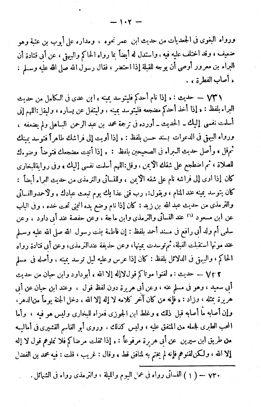 731 - حديث إذا نام أحدكم فليتوسد يمينه بن عدي في الكامل من حديث البراء بلفظ إذا أخذ أحدكم مضجعه فليتوسد يمينه وليتفل عن يساره وليقل اللهم إني أسلمت نفسي إليك الحديث أورده في ترجمة محمد بن عبد الرحمن الباهلي ولم يضعفه ورواه البيهقي في الدعوات بسند حسن بلفظ إذا أويت إلى فراشكم طاهرا فتوسد يمينك ثم قل وأصل حديث البراء في الصحيحين بلفظ إذا أتيت مضجعك فتوضأ وضوءك للصلاة ثم اضطجع على شقك الأيمن وقل اللهم أسلمت نفسي إليك وفي رواية للبخاري كان إذا أوى إلى فراشه نام على شقه الأيمن وللنسائي والترمذي من حديث البراء أيضا كان يتوسد يمينه عند المنام ويقول رب قني عذابك يوم تبعث عبادك ولأحمد والنسائي والترمذي من حديث عبد الله بن زيد كان إذا نام وضع يده اليمنى تحت خده وفي الباب عن بن مسعود 1 عند النسائي والترمذي وابن ماجة وعن حفصة عند أبي داود وعن سلمى أم ولد أبي رافع في مسند أحمد بلفظ إن فاطمة بنت رسول الله صلى الله عليه و سلم عند موتها استقبلت القبلة ثم توسدت يمينها وعن حذيفة عند الترمذي وعن أبي قتادة رواه الحاكم والبيهقي في الدلائل بلفظ كان إذا عرس وعليه ليل توسد يمينه وأصله في مسلم