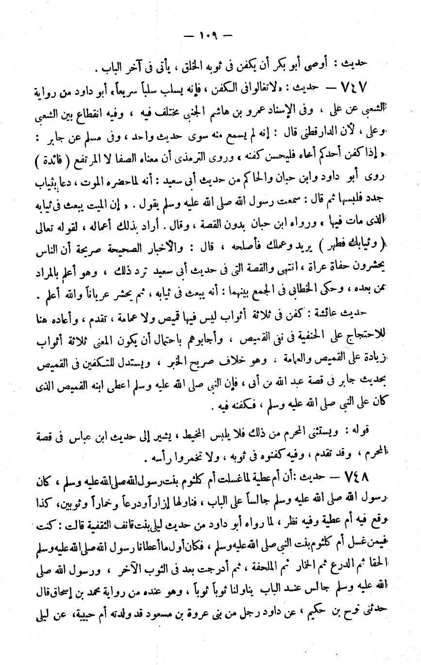 747 - حديث لا تغالوا في الكفن فإنه يسل سلبا سريعا أبو داود من رواية الشعبي عن علي وفي الإسناد عمرو بن هاشم الجنبي مختلف فيه وفيه انقطاع بين الشعبي وعلي لأن الدارقطني قال إنه لم يسمع منه سوى حديث واحد وفي مسلم عن جابر روى أبو داود وابن حبان والحاكم من حديث أبي سعيد أنه لما حضره الموت دعا بثياب جدد فلبسها ثم قال سمعت رسول الله صلى الله عليه و سلم يقول إن الميت يبعث في ثيابه الذي مات فيها ورواه بن حبان بدون القصة وقال أراد بذلك أعماله لقوله تعالى وثيابك فطهر يريد وعملك فأصلحه قال والأخبار الصحيحة صريحة أن الناس يحشرون حفاة عراة انتهى والقصة التي في حديث أبي سعيد ترد ذلك وهو أعلم بالمراد ممن بعده وحكى الخطابي في الجمع بينهما أنه يبعث في ثيابه ثم يحشر عريانا والله أعلم