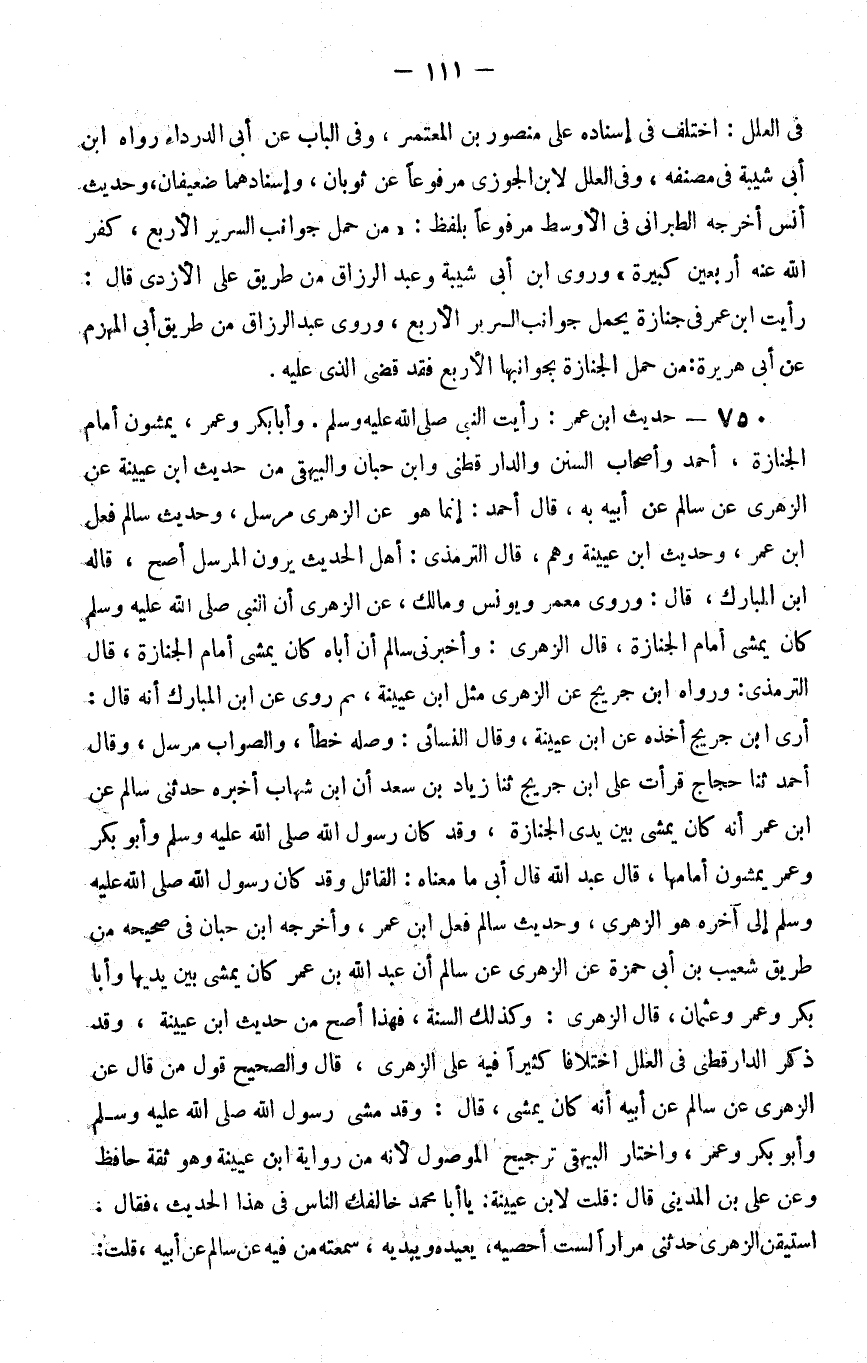 750 - حديث بن عمر رأيت النبي صلى الله عليه و سلم وأبا بكر وعمر يمشون أمام الجنازة أحمد وأصحاب السنن والدارقطني وابن حبان والبيهقي من حديث بن عيينة عن الزهري عن سالم عن أبيه به قال أحمد إنما هو عن الزهري مرسل وحديث سالم فعل بن عمر وحديث بن عيينة وهم قال الترمذي أهل الحديث يرون المرسل أصح قاله بن المبارك قال وروى معمر ويونس ومالك عن الزهري أن النبي صلى الله عليه و سلم كان يمشي أمام الجنازة قال الزهري وأخبرني سالم أن أباه كان يمشي أمام الجنازة قال الترمذي ورواه بن جريج عن الزهري مثل بن عيينة ثم روي عن بن المبارك أنه قال أرى بن جريج أخذه عن بن عيينة وقال النسائي وصله خطأ والصواب مرسل وقال أحمد ثنا حجاج قرأت على بن جريج ثنا زياد بن سعد أن بن شهاب أخبره حدثني سالم عن بن عمر أنه كان يمشي بين يدي الجنازة وقد كان رسول الله صلى الله عليه و سلم وأبو بكر وعمر يمشون أمامها قال عبد الله قال أبي ما معناه القائل وقد كان رسول الله صلى الله عليه و سلم إلى آخره هو الزهري وحديث سالم فعل بن عمر وأخرجه بن حبان في صحيحه من طريق شعيب بن أبي حمزة عن الزهري عن سالم أن عبد الله بن عمر كان يمشي بين يديها وأبا بكر وعمر وعثمان قال الزهري وكذلك السنة فهذا أصح من حديث بن عيينة وقد ذكر الدارقطني في العلل اختلافا كثيرا فيه على الزهري قال والصحيح قول من قال عن الزهري عن سالم عن أبيه أنه كان يمشي قال وقد مشى رسول الله صلى الله عليه و سلم وأبو بكر وعمر واختار البيهقي ترجيح الموصول لأنه من رواية بن عيينة وهو ثقة حافظ وعن علي بن المديني قال قلت لابن عيينة يا أبا محمد خالفك الناس في هذا الحديث فقال أستيقن الزهري حدثني مرارا لست أحصيه يعيده ويبديه سمعته من فيه عن سالم عن أبيه قلت