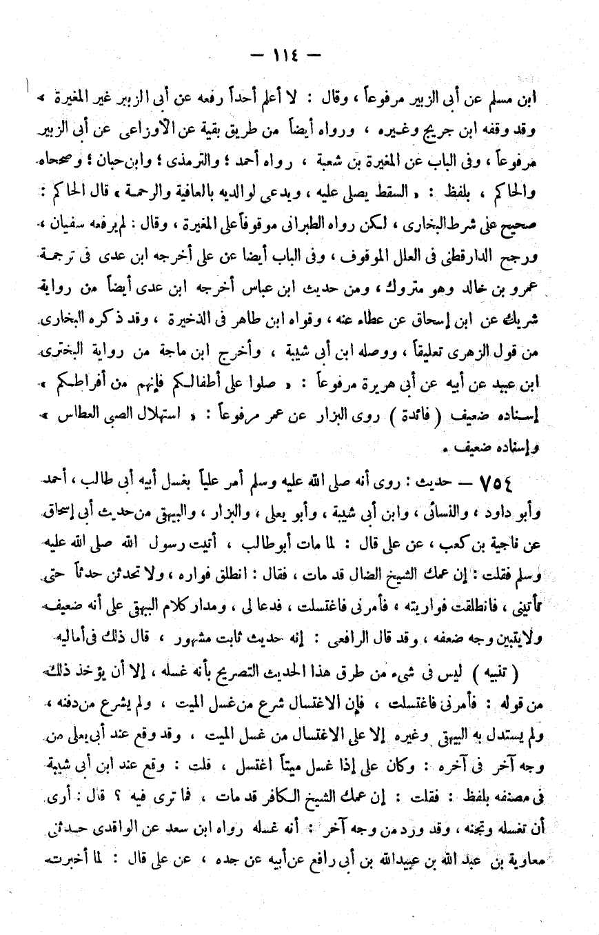 754 - حديث روي أنه صلى الله عليه و سلم أمر عليا بغسل أبيه أبي طالب أحمد وأبو داود والنسائي وابن أبي شيبة وأبو يعلى والبزار والبيهقي من حديث أبي إسحاق عن ناجية بن كعب عن علي قال لما مات أبو طالب أتيت رسول الله صلى الله عليه و سلم فقلت إن عمك الشيخ الضال قد مات فقال انطلق فواره ولا تحدثن حدثا حتى تأتيني فانطلقت فواريته فأمرني فاغتسلت فدعا لي ومدار كلام البيهقي على أنه ضعيف ولا يتبين وجه ضعفه وقد قال الرافعي إنه حديث ثابت مشهور قال ذلك في أماليه