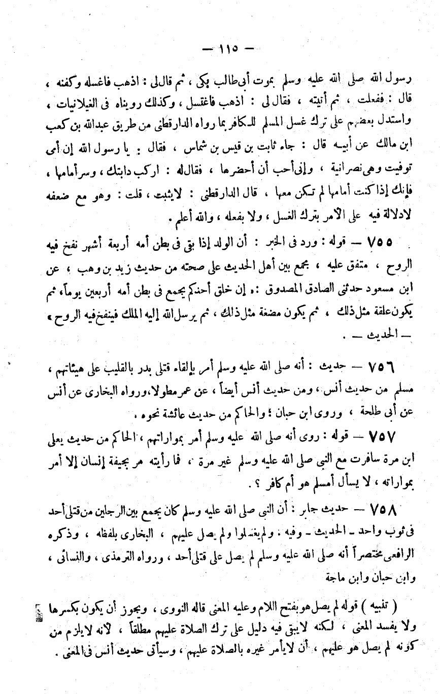 758 - حديث جابر أن النبي صلى الله عليه و سلم كان يجمع بين الرجلين من قتلى أحد في ثوب واحد الحديث وفيه ولم يغسلوا ولم يصل عليهم البخاري بلفظه وذكره الرافعي مختصرا أنه صلى الله عليه و سلم لم يصل على قتلى أحد ورواه الترمذي والنسائي وابن حبان وابن ماجة