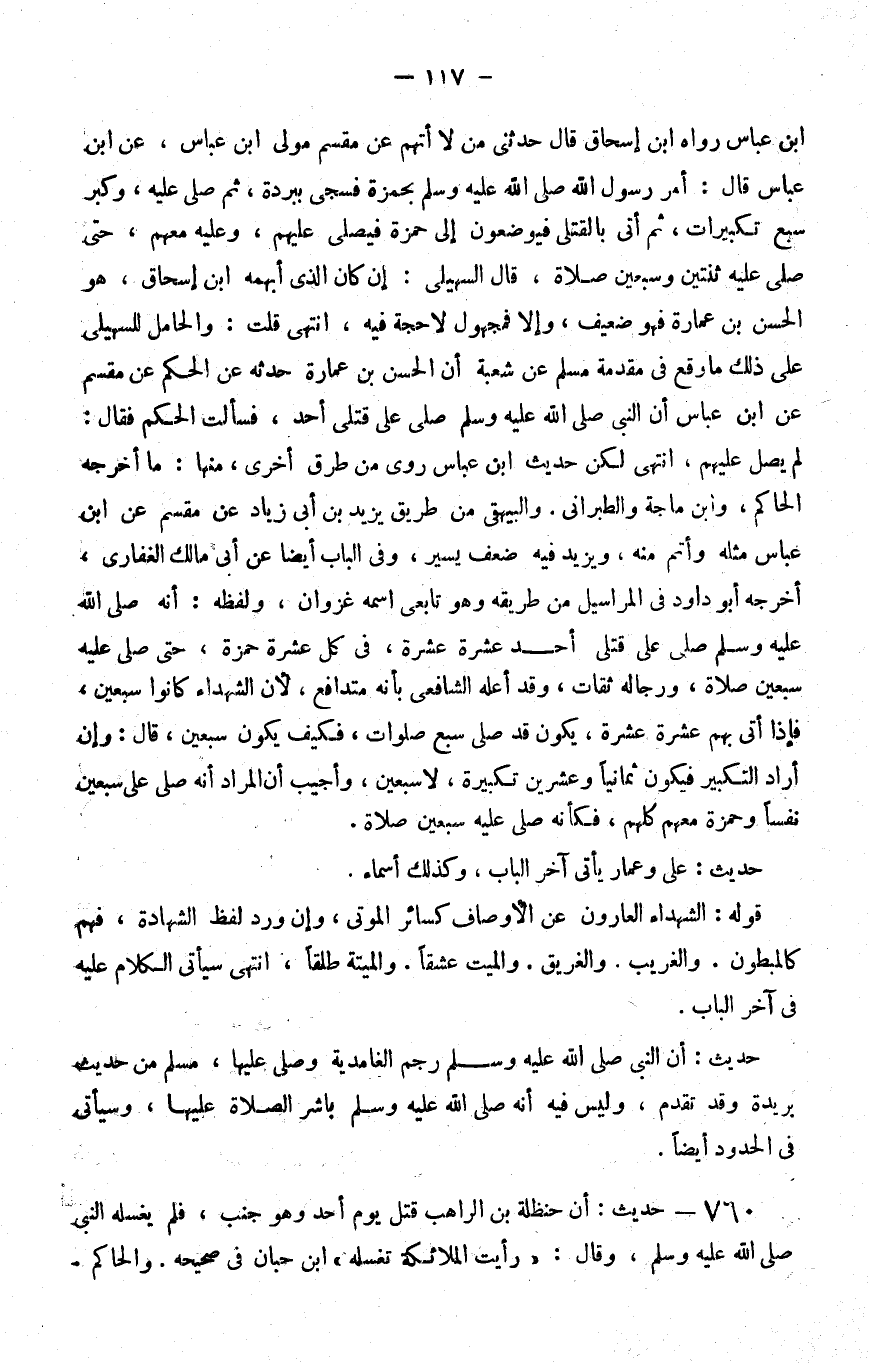 بن عباس رواه بن إسحاق قال حدثني من لا أتهم عن مقسم مولى بن عباس عن بن عباس قال أمر رسول الله صلى الله عليه و سلم بحمزة فسجي ببردة ثم صلى عليه وكبر سبع تكبيرات ثم أتي بالقتلى فيوضعون إلى حمزة فيصلى عليهم وعليه معهم حتى صلى عليه ثنتين وسبعين صلاة قال السهيلي إن كان الذي أبهمه بن إسحاق هو الحسن بن عمارة فهو ضعيف وإلا فمجهول لا حجة فيه انتهى قلت والحامل للسهيلي على ذلك ما وقع في مقدمة مسلم عن شعبة أن الحسن بن عمارة حدثه عن الحكم عن مقسم عن بن عباس أن النبي صلى الله عليه و سلم صلى على قتلى أحد فسألت الحكم فقال لم يصل عليهم انتهى لكن حديث بن عباس روي من طرق أخرى منها ما أخرجه الحاكم وابن ماجة والطبراني والبيهقي من طريق يزيد بن أبي زياد عن مقسم عن بن عباس مثله وأتم منه ويزيد فيه ضعف يسير وفي الباب أيضا عن أبي مالك الغفاري أخرجه أبو داود في المراسيل من طريقه وهو تابعي اسمه غزوان ولفظه أنه صلى الله عليه و سلم صلى على قتلى أحد عشرة عشرة في كل عشرة حمزة حتى صلى عليه سبعين صلاة ورجاله ثقات وقد أعله الشافعي بأنه متدافع لأن الشهداء كانوا سبعين فإذا أتي بهم عشرة عشرة يكون قد صلى سبع صلوات فكيف يكون سبعين قال وإن أراد التكبير فيكون ثمانيا وعشرين تكبيرة لا سبعين وأجيب أن المراد أنه صلى على سبعين نفسا وحمزة معهم كلهم فكأنه صلى عليه سبعين صلاة