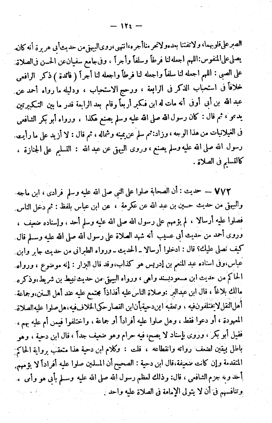 772 - حديث أن الصحابة صلوا على النبي صلى الله عليه و سلم فرادى بن ماجة والبيهقي من حديث حسين بن عبد الله عن عكرمة عن بن عباس بلفظ ثم دخل الناس فصلوا عليه أرسالا لم يؤمهم على رسول الله صلى الله عليه و سلم أحد وإسناده ضعيف وروى أحمد من حديث أبي عسيب أنه شهد الصلاة على رسول الله صلى الله عليه و سلم قال كيف نصلي عليك قال ادخلوا أرسالا الحديث ورواه الطبراني من حديث جابر وابن عباس وفي إسناده عبد المنعم بن إدريس هو كذاب وقد قال البزار إنه موضوع ورواه الحاكم من حديث بن مسعود بسند واهي ورواه البيهقي من حديث نبيط بن شريط وذكره مالك بلاغا قال بن عبد البر وصلاة الناس عليه أفذاذا مجتمع عليه عند أهل السنن وجماعة أهل النقل لا يختلفون فيه وتعقبه بن دحية بأن بن القصار حكى الخلاف فيه هل صلوا عليه الصلاة المعهودة أو دعوا فقط وهل صلوا عليه أفرادا أو جماعة واختلفوا فيمن أم عليه بهم فقيل أبو بكر وروي بإسناد لا يصح فيه حرام وهو ضعيف جدا قال بن دحية وهو باطل بيقين لضعف رواته وانقطاعه قلت وكلام بن دحية هذا متعقب برواية الحاكم المتقدمة وإن كانت ضعيفة قال بن دحية الصحيح أن المسلمين صلوا عليه أفرادا لا يؤمهم أحد وبه جزم الشافعي قال وذلك لعظم رسول الله صلى الله عليه و سلم بأبي هو وأمي وتنافسهم في أن لا يتولى الإمامة في الصلاة عليه واحد
