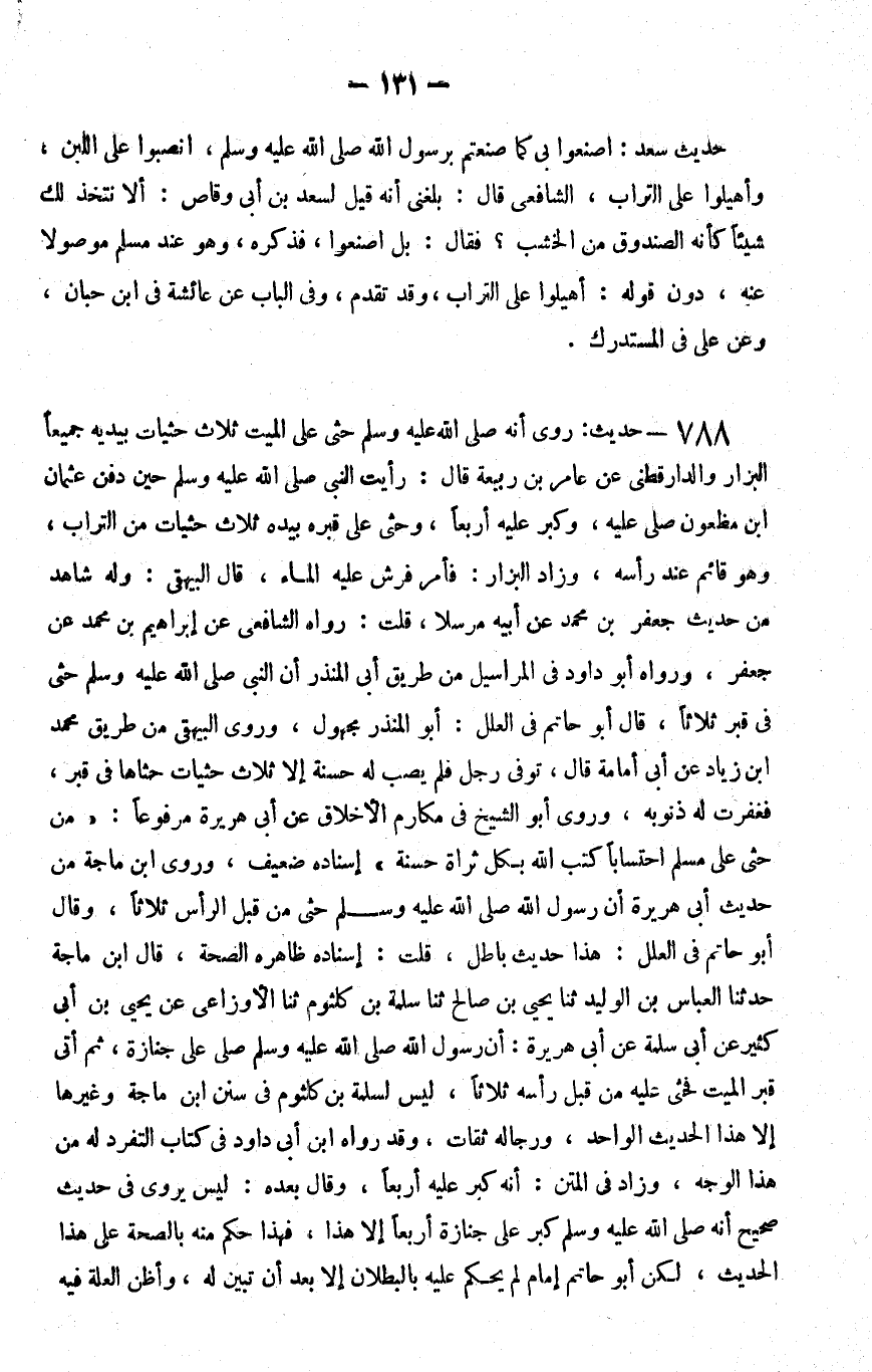 788 - حديث روي أنه صلى الله عليه و سلم حثى على الميت ثلاث حثيات بيديه جميعا البزار والدارقطني عن عامر بن ربيعة قال رأيت النبي صلى الله عليه و سلم حين دفن عثمان بن مظعون صلى عليه وكبر عليه أربعا وحثى على قبره بيده ثلاث حثيات من التراب وهو قائم عند رأسه وزاد البزار فأمر فرش عليه الماء قال البيهقي وله شاهد من حديث جعفر بن محمد عن أبيه مرسلا قلت رواه الشافعي عن إبراهيم بن محمد عن جعفر ورواه أبو داود في المراسيل من طريق أبي المنذر أن النبي صلى الله عليه و سلم حثى في قبر ثلاثا قال أبو حاتم في العلل أبو المنذر مجهول وروى البيهقي من طريق محمد بن زياد عن أبي أمامة قال توفي رجل فلم يصب له حسنة إلا ثلاث حثيات حثاها في قبر فغفرت له ذنوبه وروى أبو الشيخ في مكارم الأخلاق عن أبي هريرة مرفوعا من حثى على مسلم احتسابا كتب الله بكل ثراة حسنة إسناده ضعيف وروى بن ماجة من حديث أبي هريرة أن رسول الله صلى الله عليه و سلم حثى من قبل الرأس ثلاثا وقال أبو حاتم في العلل هذا حديث باطل قلت إسناده ظاهره الصحة قال بن ماجة حدثنا العباس بن الوليد ثنا يحيى بن صالح ثنا سلمة بن كلثوم ثنا الأوزاعي عن يحيى بن أبي كثير عن أبي سلمة عن أبي هريرة أن رسول الله صلى الله عليه و سلم صلى على جنازة ثم أتى قبر الميت فحثى عليه من قبل رأسه ثلاثا ليس لسلمة بن كلثوم في سنن بن ماجة وغيرها إلا هذا الحديث الواحد ورجاله ثقات وقد رواه بن أبي داود في كتاب التفرد له من هذا الوجه وزاد في المتن أنه كبر عليه أربعا وقال بعده ليس يروى في حديث صحيح أنه صلى الله عليه و سلم كبر على جنازة أربعا إلا هذا فهذا حكم منه بالصحة على هذا الحديث لكن أبو حاتم إمام لم يحكم عليه بالبطلان إلا بعد أن تبين له وأظن العلة فيه