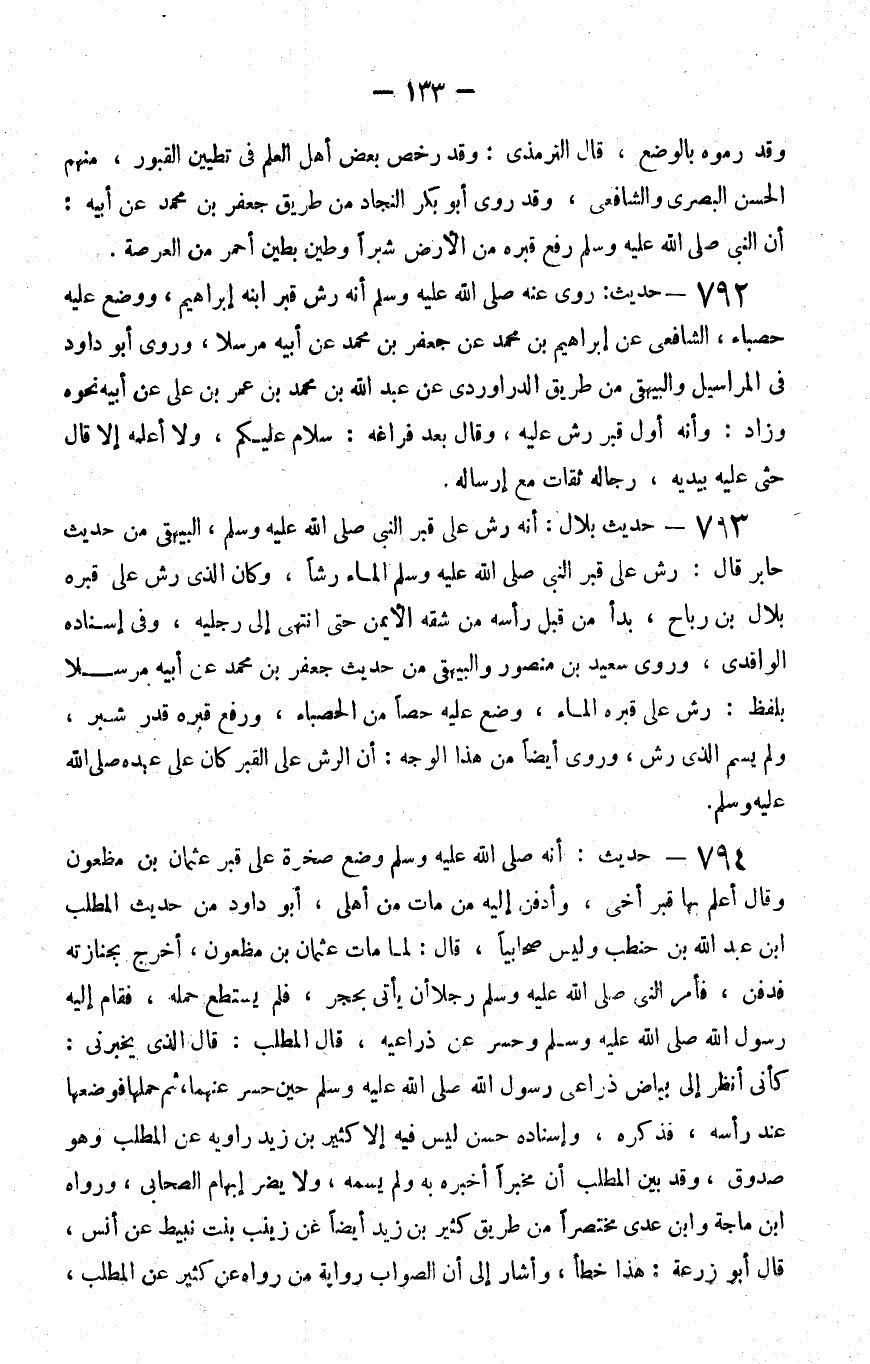 793 - حديث بلال أنه رش على قبر النبي صلى الله عليه و سلم البيهقي من حديث جابر قال رش على قبر النبي صلى الله عليه و سلم الماء رشا وكان الذي رش على قبره بلال بن رباح بدأ من قبل رأسه من شقه الأيمن حتى انتهى إلى رجليه وفي إسناده الواقدي وروى سعيد بن منصور والبيهقي من حديث جعفر بن محمد عن أبيه مرسلا بلفظ رش على قبره الماء وضع عليه حصا من الحصباء ورفع قبره قدر شبر ولم يسم الذي رش وروي أيضا من هذا الوجه أن الرش على القبر كان على عهده صلى الله عليه و سلم