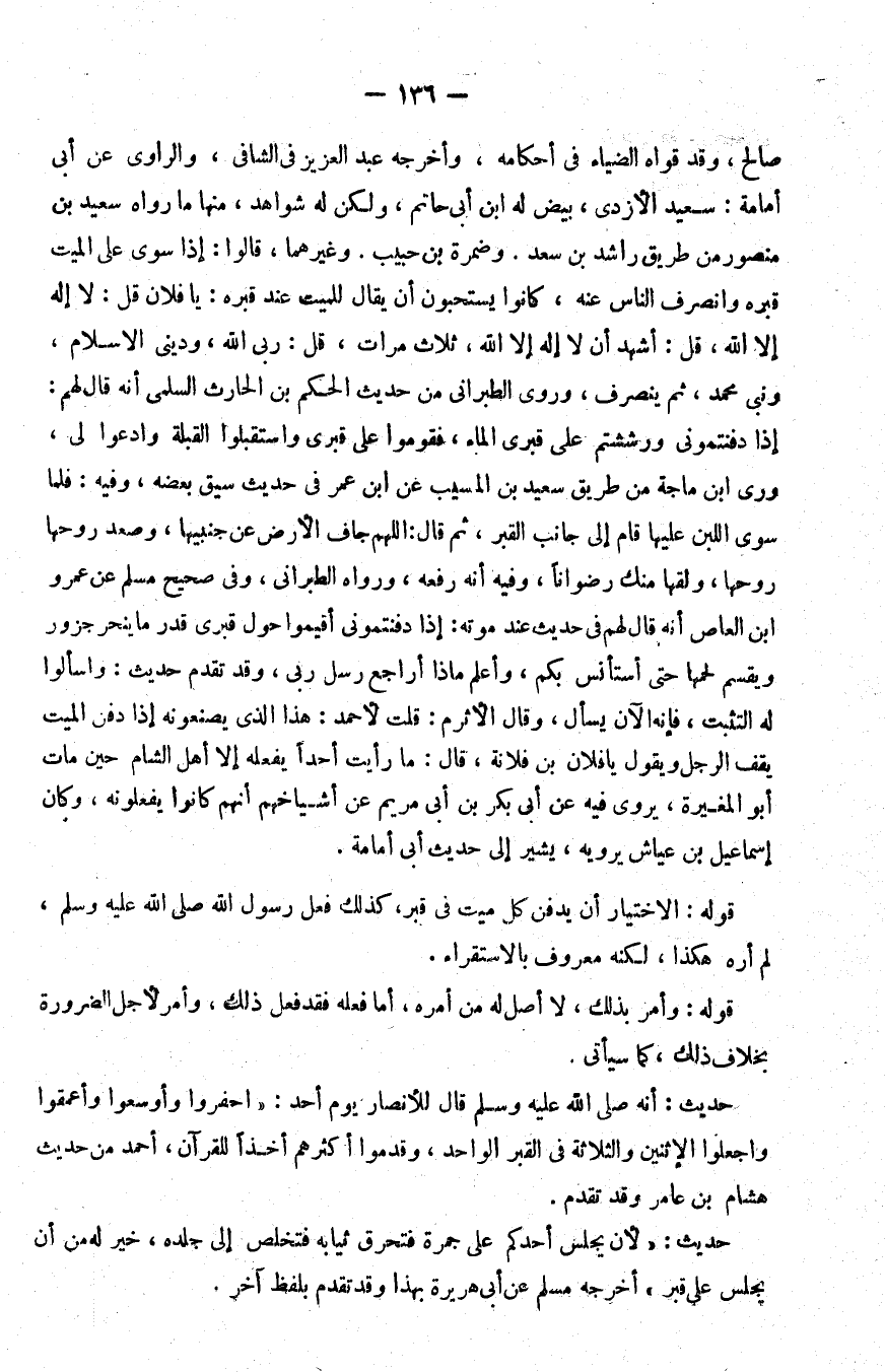 صالح وقد قواه الضياء في أحكامه وأخرجه عبد العزيز في الشافي والراوي عن أبي أمامة سعيد الآزدي بيض له بن أبي حاتم ولكن له شواهد منها ما رواه سعيد بن منصور من طريق راشد بن سعد وضمرة بن حبيب وغيرهما قالوا إذا سوي على الميت قبره وانصرف الناس عنه كانوا يستحبون أن يقال للميت عند قبره يا فلان قل لا إله إلا الله قل أشهد أن لا إله إلا الله ثلاث مرات قل ربي الله وديني الإسلام ونبيي محمد ثم يصرف وروى الطبراني من حديث الحكم بن الحارث السلمي أنه قال لهم إذا دفنتموني ورششتم على قبري الماء فقوموا على قبري واستقبلوا القبلة وادعوا لي روى بن ماجة من طريق سعيد بن المسيب عن بن عمر في حديث سبق بعضه وفيه فلما سوى اللبن عليها قام إلى جانب القبر ثم قال اللهم جاف الأرض عن جنبيها وصعد روحها روحها ولقها منك رضوانا وفيه أنه رفعه ورواه الطبراني وفي صحيح مسلم عن عمرو بن العاص أنه قال لهم في حديث عند موته إذا دفنتموني أقيموا حول قبري قدر ما ينحر جزور ويقسم لحمها حتى أستأنس بكم وأعلم ماذا أراجع رسل ربي وقد تقدم حديث واسألوا له التثبت فإنه الآن يسأل وقال الأثرم قلت لأحمد هذا الذي يصنعونه إذا دفن الميت يقف الرجل ويقول يا فلان بن فلانة قال ما رأيت أحدا يفعله إلا أهل الشام حين مات أبو المغيرة يورى فيه عن أبي بكر بن أبي مريم عن أشياخهم أنهم كانوا يفعلونه وكان إسماعيل بن عياش يرويه يشير إلى حديث أبي أمامة