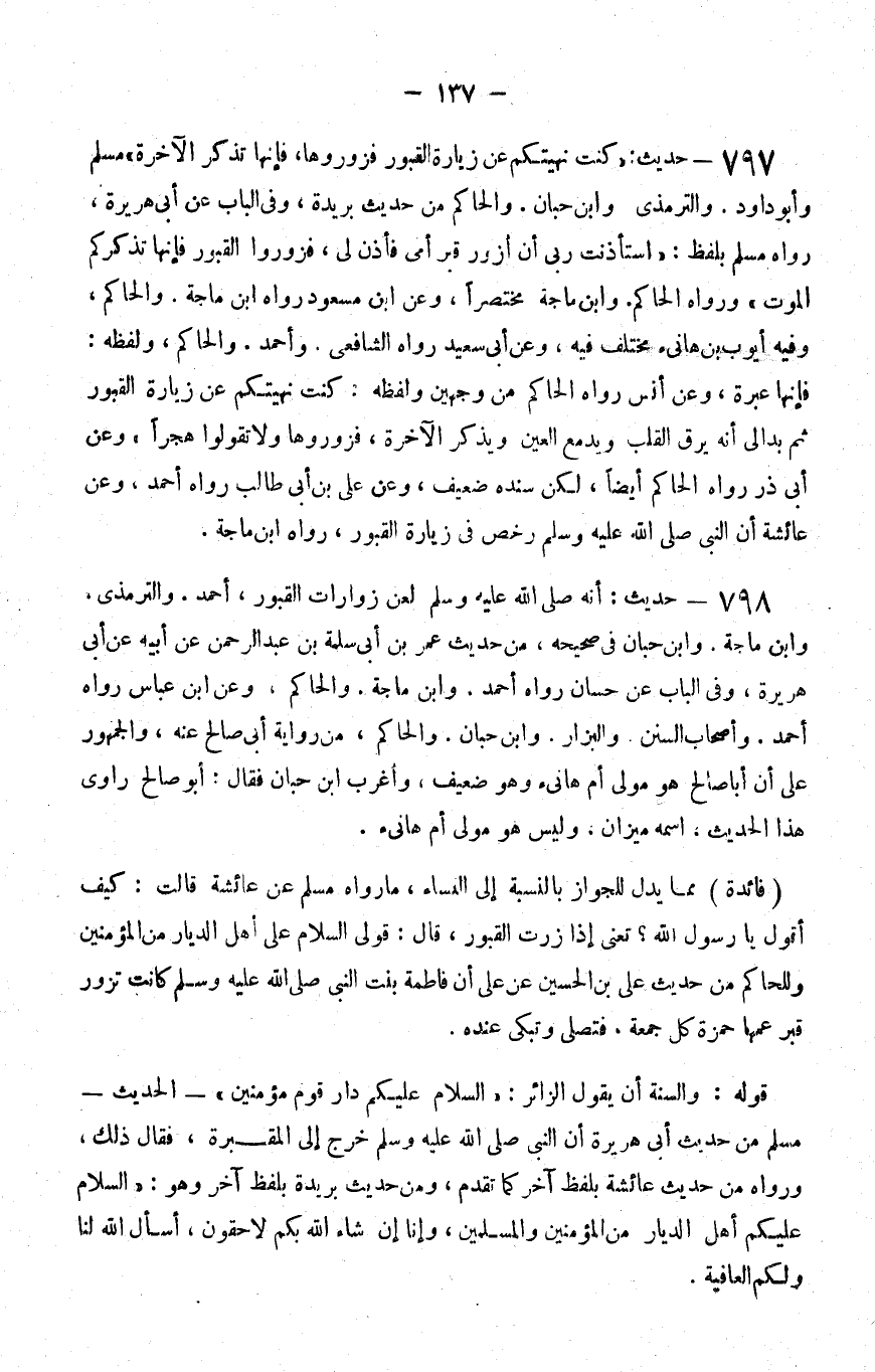 797 - حديث كنت نهيتكم عن زيارة القبور فزوروها فإنها تذكر الآخرة مسلم وأبو داود والترمذي وابن حبان والحاكم من حديث بريدة وفي الباب عن أبي هريرة رواه مسلم بلفظ استأذنت ربي أن أزور قبر أمي فأذن لي فزوروا القبور فإنها تذكركم الموت ورواه الحاكم وابن ماجة مختصرا وعن بن مسعود رواه بن ماجة والحاكم وفيه أيوب بن هانئ مختلف فيه وعن أبي سعيد رواه الشافعي وأحمد والحاكم ولفظه فإنها عبرة وعن أنس رواه الحاكم من وجهين ولفظه كنت نهيتكم عن زيارة القبور ثم بدا لي أنه يرق القلب ويدمع العين ويذكر الآخرة فزوروها ولا تقولوا هجرا وعن أبي ذر رواه الحاكم أيضا لكن سنده ضعيف وعن علي بن أبي طالب رواه أحمد وعن عائشة أن النبي صلى الله عليه و سلم رخص في زيارة القبور رواه بن ماجة