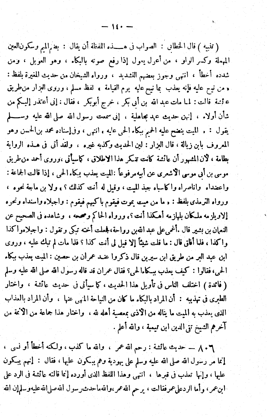 806 - حديث عائشة رحم الله عمر والله ما كذب ولكنه أخطأ أو نسي إنما مر رسول الله صلى الله عليه و سلم على يهودية وهم يبكون عليها فقال إنهم يبكون عليها وإنها تعذب في قبرها انتهى وهذا اللفظ الذي أورده إنما قالته عائشة في الرد على بن عمر وأما الرد على عمر فقالت يرحم الله عمر والله ما حدث رسول الله صلى الله عليه و سلم إن الله