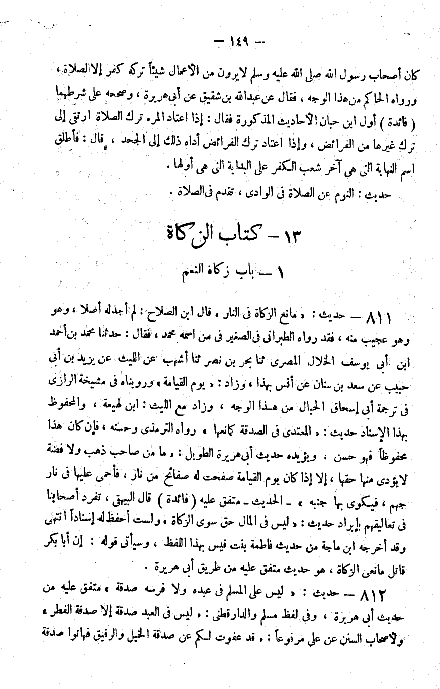 811 - حديث مانع الزكاة في النار قال بن الصلاح لم أجد له أصلا وهو عجيب منه فقد رواه الطبراني في الصغر في من اسمه محمد فقال حدثنا محمد بن أحمد بن أبي يوسف الخلال المصري ثنا بحر بن نصر ثنا أشهب عن الليث عن يزيد بن أبي حبيب عن سعد بن سنان عن أنس بهذا وزاد يوم القيامة ورويناه في مشيخة الرازي في ترجمة أبي إسحاق الحبال من هذا الوجه وزاد مع الليث بن لهيعة والمحفوظ بهذا الإسناد حديث المعتدي في الصدقة كمانعها رواه الترمذي وحسنه فإن كان هذا محفوظا فهو حسن ويؤيده حديث أبي هريرة الطويل ما من صاحب ذهب ولا فضة لا يؤدي منها حقها إلا إذا كان يوم القيامة صفحت له صفائح من نار فأحمي عليها في نار جهنم فيكوى بها جنبه الحديث متفق عليه