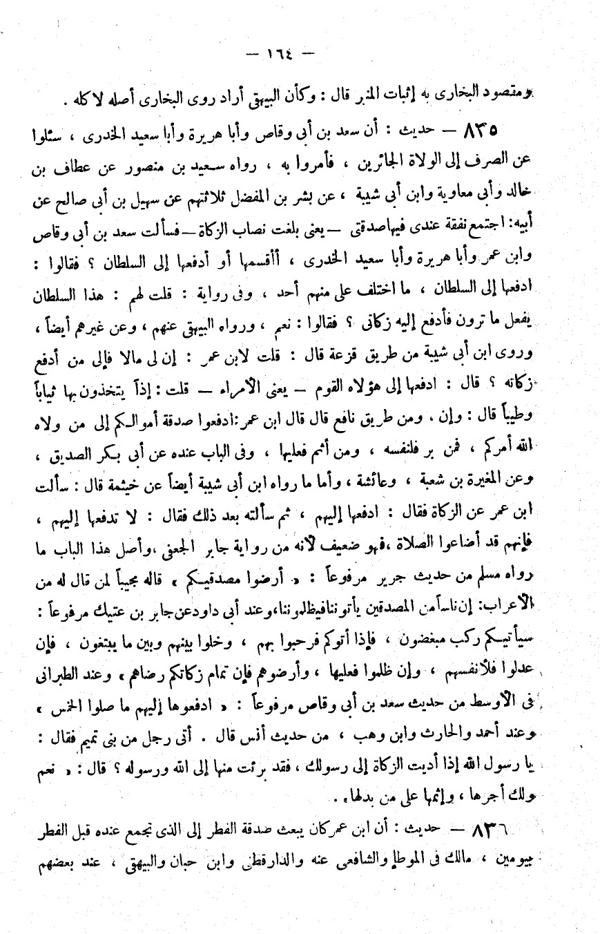 835 - حديث أن سعد بن أبي وقاص وأبا هريرة وأبا سعيد الخدري سئلوا عن الصرف إلى الولاة الجائرين فأمروا به رواه سعيد بن منصور عن عطاف بن خالد وأبي معاوية وابن أبي شيبة عن بشر بن المفضل ثلاثتهم عن سهيل بن أبي صالح عن أبيه اجتمع نفقة عندي فيها صدقتي يعني بلغت نصاب الزكاة فسألت سعد بن أبي وقاص وابن عمر وأبا هريرة وأبا سعيد الخدري أأقسمها أو أدفعها إلى السلطان فقالوا ادفعها إلى السلطان ما اختلف على منهم أحد وفي رواية قلت لهم هذا السلطان يفعل ما ترون فأدفع إليه زكاتي فقالوا نعم ورواه البيهقي عنهم وعن غيرهم أيضا وروى بن أبي شيبة من طريق قزعة قال قلت لابن عمر إن لي مالا فإلى من أدفع زكاته قال ادفعها إلى هؤلاء القوم يعني الأمراء قلت إذا يتخذون بها ثيابا وطيبا قال وإن ومن طريق نافع قال قال بن عمر ادفعوا صدقة أموالكم إلى من ولاه الله أمركم فمن بر فلنفسه ومن أثم فعليها وفي الباب عنده عن أبي بكر الصديق وعن المغيرة بن شعبة وعائشة وأما ما رواه بن أبي شيبة أيضا عن خيثمة قال سألت بن عمر عن الزكاة فقال ادفعها إليهم ثم سألته بعد ذلك فقال لا تدفعها إليهم فإنهم قد أضاعوا الصلاة فهو ضعيف لأنه من رواية جابر الجعفي وأصل هذا الباب ما رواه مسلم من حديث جرير مرفوعا أرضوا مصدقيكم قاله مجيبا لمن قال له من الأعراب إن ناسا من المصدقين يأتوننا فيظلموننا وعند أبي داود عن جابر بن عتيك مرفوعا سيأتيكم ركب مبغضون فإذا أتوكم فرحبوا بهم وخلوا بينهم وبين ما يبتغون فإن عدلوا فلأنفسهم وإن ظلموا فعليها وأرضوهم فإن تمام زكاتكم رضاهم وعند الطبرني في الأوسط من حديث سعد بن أبي وقاص مرفوعا ادفعوها إليهم ما صلوا الخمس وعند أحمد والحارث وابن وهب من حديث أنس قال أتى رجل من بني تميم فقال يا رسول الله إذا أديت الزكاة إلى رسولك فقد برئت منها إلى الله ورسوله قال نعم ولك أجرها وإثمها على من بدلها
