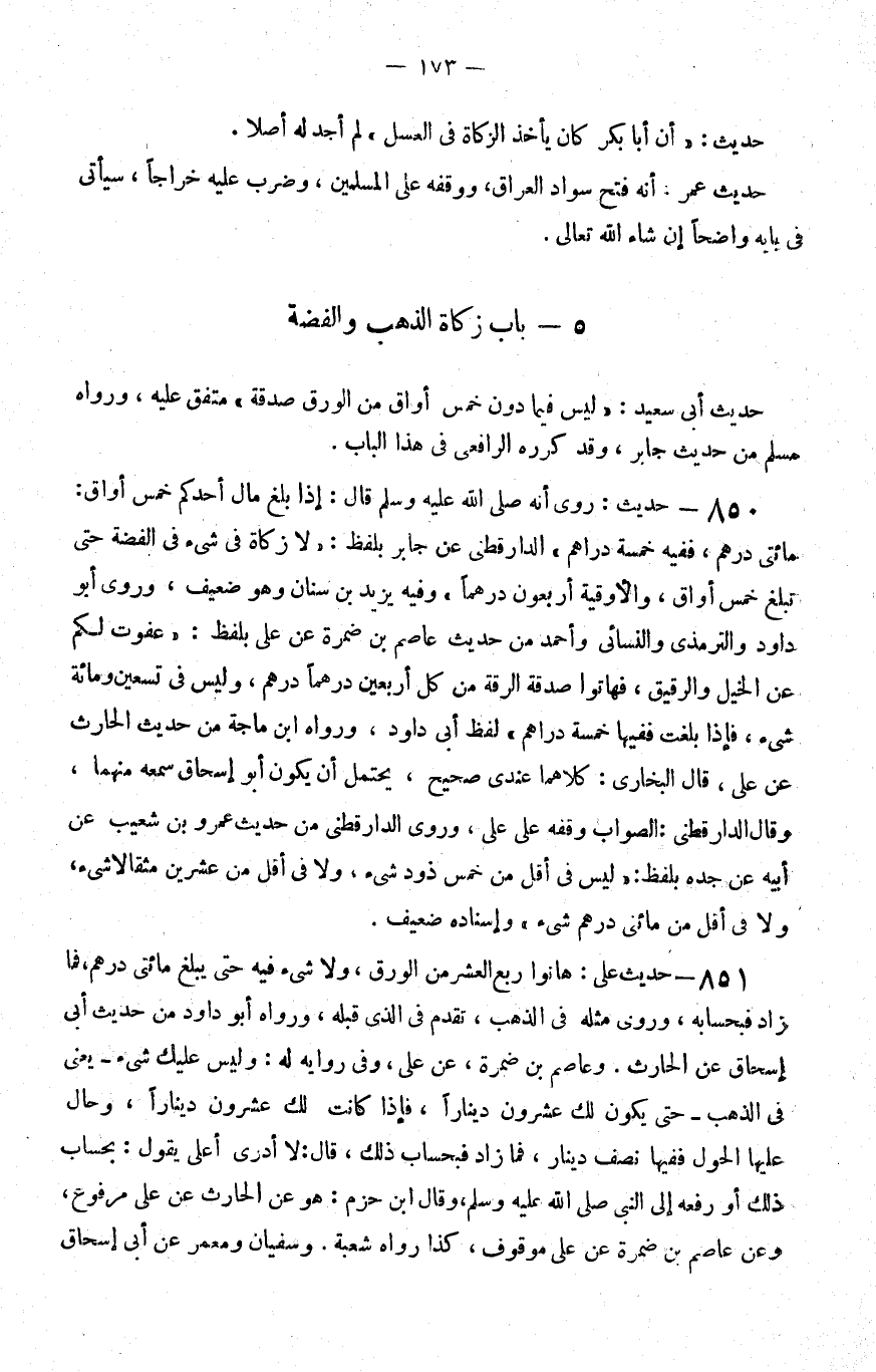 851 - حديث علي هاتوا ربع العشر من الورق ولا شيء فيه حتى يبلغ مائتي درهم فما زاد فبحسابه وروى مثله في الذهب تقدم في الذي قبله ورواه أبو داود من حديث أبي إسحاق عن الحارث وعاصم بن ضمرة عن علي وفي رواية له وليس عليك شيء يعني في الذهب حتى يكون لك عشرون دينارا فإذا كانت لك عشرون دينارا وحال عليها الحول ففيها نصف دينار فما زاد فبحساب ذلك قال لا أدري أعلي يقول بحساب ذلك أو رفعه إلى النبي صلى الله عليه و سلم وقال بن حزم هو عن الحارث عن علي مرفوع وعن عاصم بن ضمرة عن علي موقوف كذا رواه شعبة وسفيان ومعمر عن أبي إسحاق