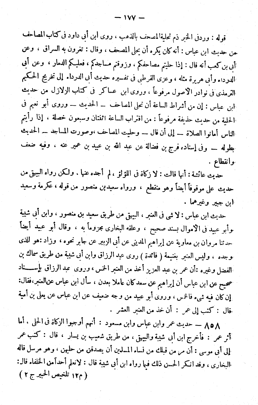 858 - حديث عمر وابن عباس وابن مسعود أنهم أوجبوا الزكاة في الحلى أما أثر عمر فأخرج بن أبي شيبة والبيهقي من طريق شعيب بن يسار قال كتب عمر إلى أبي موسى أن مر من قبلك من نساء المسلمين أن يصدقن من حليهن وهو مرسل قاله البخاري وقد أنكر الحسن ذلك فيما رواه بن أبي شيبة قال لا نعلم أحدا من الخلفاء قال