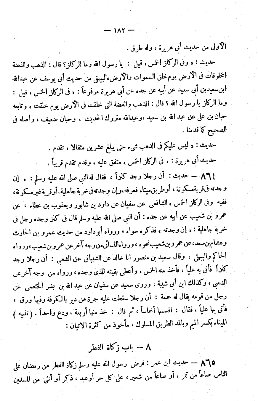 864 - حديث أن رجلا وجد كنزا فقال له النبي صلى الله عليه و سلم إن وجدته في قرية مسكونة أو طريق ميتاء فعرفه وإن وجدته في خربة جاهلية أو قرية غير مسكونة ففيه وفي الركاز الخمس الشافعي عن سفيان عن داود بن شابور ويعقوب بن عطاء عن عمرو بن شعيب عن أبيه عن جده أن النبي صلى الله عليه و سلم قال في كنز وجده رجل في خربة جاهلية إن وجدته فذكره سواء ورواه أبو داود من حديث عمرو بن الحارث وهشام بن سعد عن عمرو بن شعيب نحوه ورواه النسائي من وجه آخر عن عمرو بن شعيب ورواه الحاكم والبيهقي وقال سعيد بن منصور انا خالد عن الشيباني عن الشعبي أن رجلا وجد كنزا فأتى به عليا فأخذ منه الخمس وأعطى بقيته للذي وجده ورواه من وجه آخر عن الشعبي وكذلك بن أبي شيبة وروى سعيد عن سفيان عن عبد الله بن بشر الخثعمي عن رجل من قومه يقال له حممة أن رجلا سقطت عليه جرة من دير بالكوفة وفيها ورق فأتى بها عليا فقال اقسمها أخماسا ثم قال خذ منها أربعة ودع واحدا