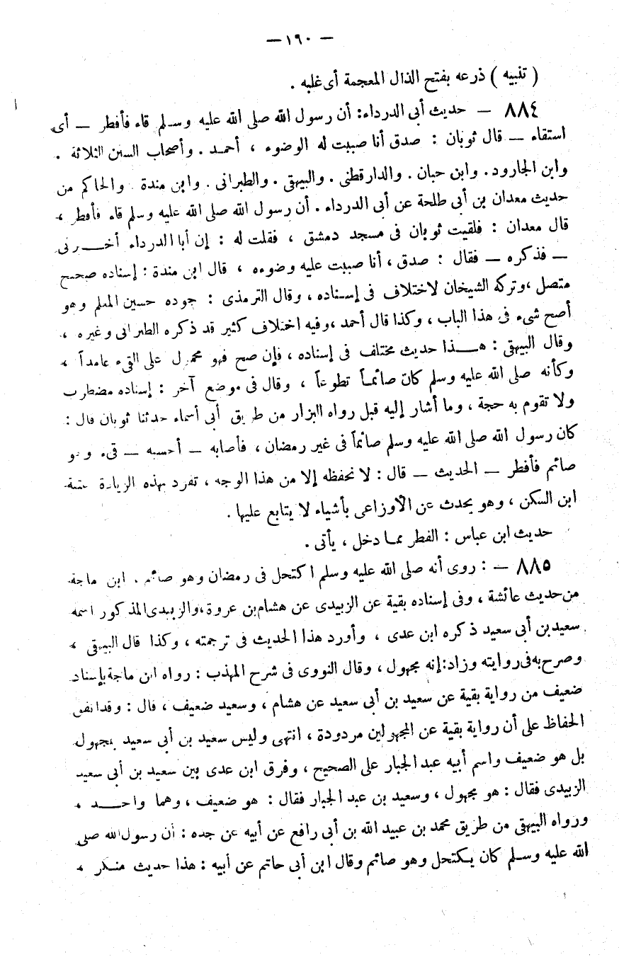 884 - حديث أبي الدرداء أن رسول الله صلى الله عليه و سلم قاء فأفطر أي استقاء قال ثوبان صدق أنا صببت له الوضوء أحمد وأصحاب السنن الثلاثة وابن الجارود وابن حبان والدارقطني والبيهقي والطبراني وابن مندة والحاكم من حديث معدان بن أبي طلحة عن أبي الدرداء أن رسول الله صلى الله عليه و سلم قاء فأفطر قال معدان فلقيت ثوبان في مسجد دمشق فقلت له إن أبا الدرداء أخبرني فذكره فقال صدق أنا صببت عليه وضوءه قال بن مندة إسناده صحيح متصل وتركه الشيخان لاختلاف في إسناده وقال الترمذي جوده حسين المعلم وهو أصح شيء في هذا الباب وكذا قال أحمد وفيه اختلاف كثير قد ذكره الطبراني وغيره وقال البيهقي هذا حديث مختلف في إسناده فإن صح فهو محمول على القيء عامدا وكأنه صلى الله عليه و سلم كان صائما تطوعا وقال في موضع آخر إسناده مضطرب ولا تقوم به حجة وما أشار إليه قبل رواه البزار من طريق أبي أسماء حدثنا ثوبان قال كان رسول الله صلى الله عليه و سلم صائما في غير رمضان فأصابه أحسبه قيء وهو صائم فأفطر الحديث قال لا نحفظه إلا من هذا الوجه تفرد بهذه الزيادة عتبة بن السكن وهو يحدث عن الأوزاعي بأشياء لا يتابع عليها