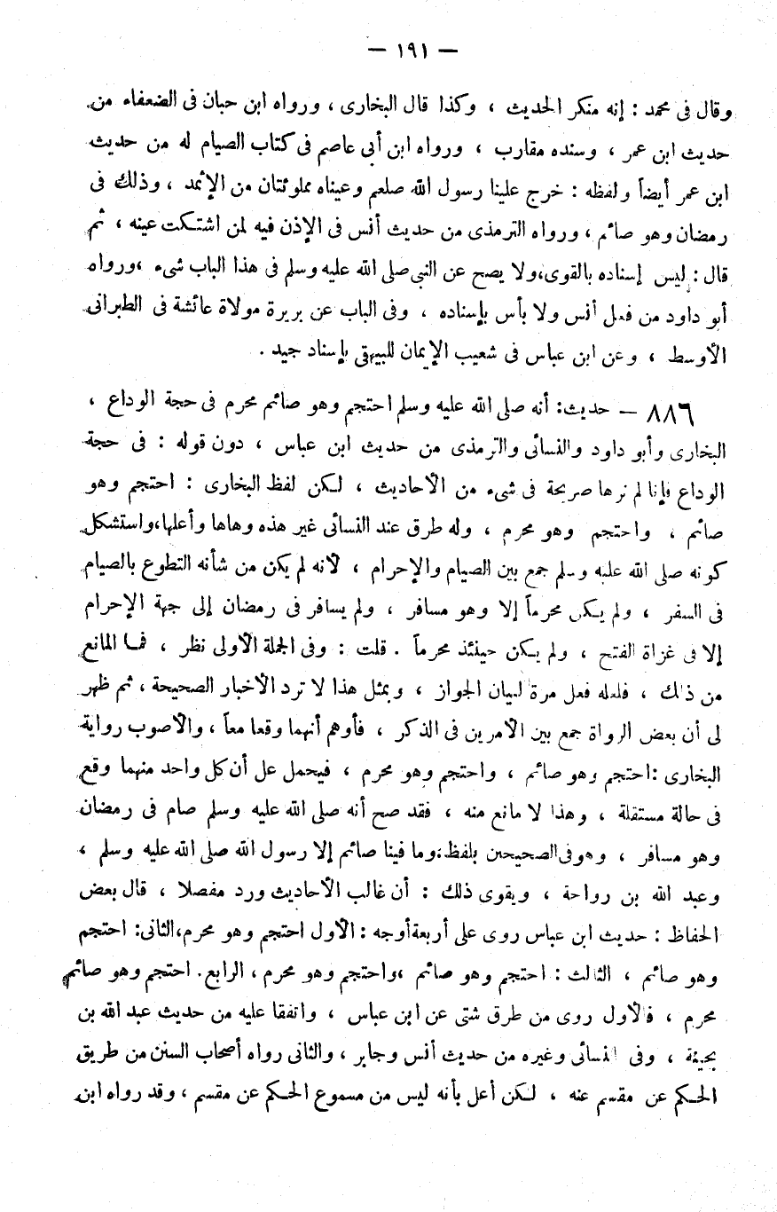 886 - حديث أنه صلى الله عليه و سلم احتجم وهو صائم محرم في حجة الوداع البخاري وأبو داود والنسائي والترمذي من حديث بن عباس دون قوله في حجة الوداع فإنا لم نرها صريحة في شيء من الأحاديث لكن لفظ البخاري احتجم وهو صائم واحتجم وهو محرم وله طرق عند النسائي غير هذه وهاها وأعلها واستشكل كونه صلى الله عليه و سلم جمع بين الصيام والإحرام لأنه لم يكن من شأنه التطوع بالصيام في السفر ولم يكن محرما إلا وهو مسافر ولم يسافر في رمضان إلى جهة الإحرام إلا في غزاة الفتح ولم يكن حينئذ محرما قلت وفي الجملة الأولى نظر فما المانع من ذلك فلعله فعل مرة لبيان الجواز وبمثل هذا لا ترد الأخبار الصحيحة ثم ظهر لي أن بعض الرواة جمع بين الأمرين في الذكر فأوهم أنهما وقعا معا والأصوب رواية البخاري احتجم وهو صائم واحتجم وهو محرم فيحمل على أن كل واحد منهما وقع في حالة مستقلة وهذا لا مانع منه فقد صح أنه صلى الله عليه و سلم صام في رمضان وهو مسافر وهو في الصحيحين بلفظ وما فينا صائم إلا رسول الله صلى الله عليه و سلم وعبد الله بن رواحة ويقوي ذلك أن غالب الأحاديث ورد مفصلا قال بعض الحفاظ حديث بن عباس روي على أربعة أوجه الأول احتجم وهو محرم الثاني احتجم وهو صائم الثالث احتجم وهو صائم واحتجم وهو محرم الرابع احتجم وهو صائم محرم فالأول روي من طرق شتى عن بن عباس واتفقا عليه من حديث عبد الله بن بحينة وفي النسائي وغيره من حديث أنس وجابر والثاني رواه أصحاب السنن من طريق الحكم عن مقسم عنه لكن أعل بأنه ليس من مسموع الحكم عن مقسم وقد رواه بن