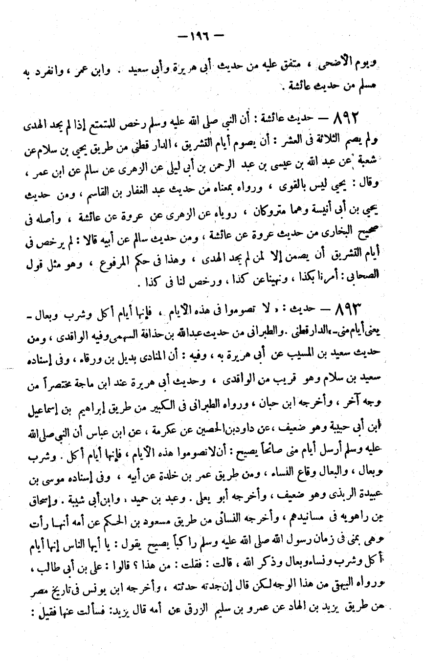 893 - حديث لا تصوموا في هذه الأيام فإنها أيام أكل وشرب وبعال يعني أيام منى الدارقطني والطبراني من حديث عبد الله بن حذافة السهمي وفيه الواقدي ومن حديث سعيد بن المسيب عن أبي هريرة به وفيه أن المنادي بديل بن ورقاء وفي إسناده سعيد بن سلام وهو قريب من الواقدي وحديث أبي هريرة عند بن ماجة مختصرا من وجه آخر وأخرجه بن حبان ورواه الطبراني في الكبير من طريق إبراهيم بن إسماعيل بن أبي حبيبة وهو ضعيف عن داود بن الحصين عن عكرمة عن بن عباس أن النبي صلى الله عليه و سلم أرسل أيام منى صائحا يصيح أن لا تصوموا هذه الأيام فإنها أيام أكل وشرب وبعال والبعال وقاع النساء ومن طريق عمر بن خلدة عن أبيه وفي إسناده موسى بن عبيدة الربذي وهو ضعيف وأخرجه أبو يعلى وعبد بن حميد وابن أبي شيبة وإسحاق بن راهويه في مسانيدهم وأخرجه النسائي من طريق مسعود بن الحكم عن أمه أنها رأت وهي بمنى في زمان رسول الله صلى الله عليه و سلم راكبا يصيح يقول يا أيها الناس إنها أيام أكل وشرب ونساء وبعال وذكر الله قالت فقلت من هذا قالوا علي بن أبي طالب ورواه البيهقي من هذا الوجه لكن قال إن جدته حدثته وأخرجه بن يونس في تاريخ مصر من طريق يزيد بن الهاد عن عمرو بن سليم الزرقي عن أمه قال يزيد فسألت عنها فقيل