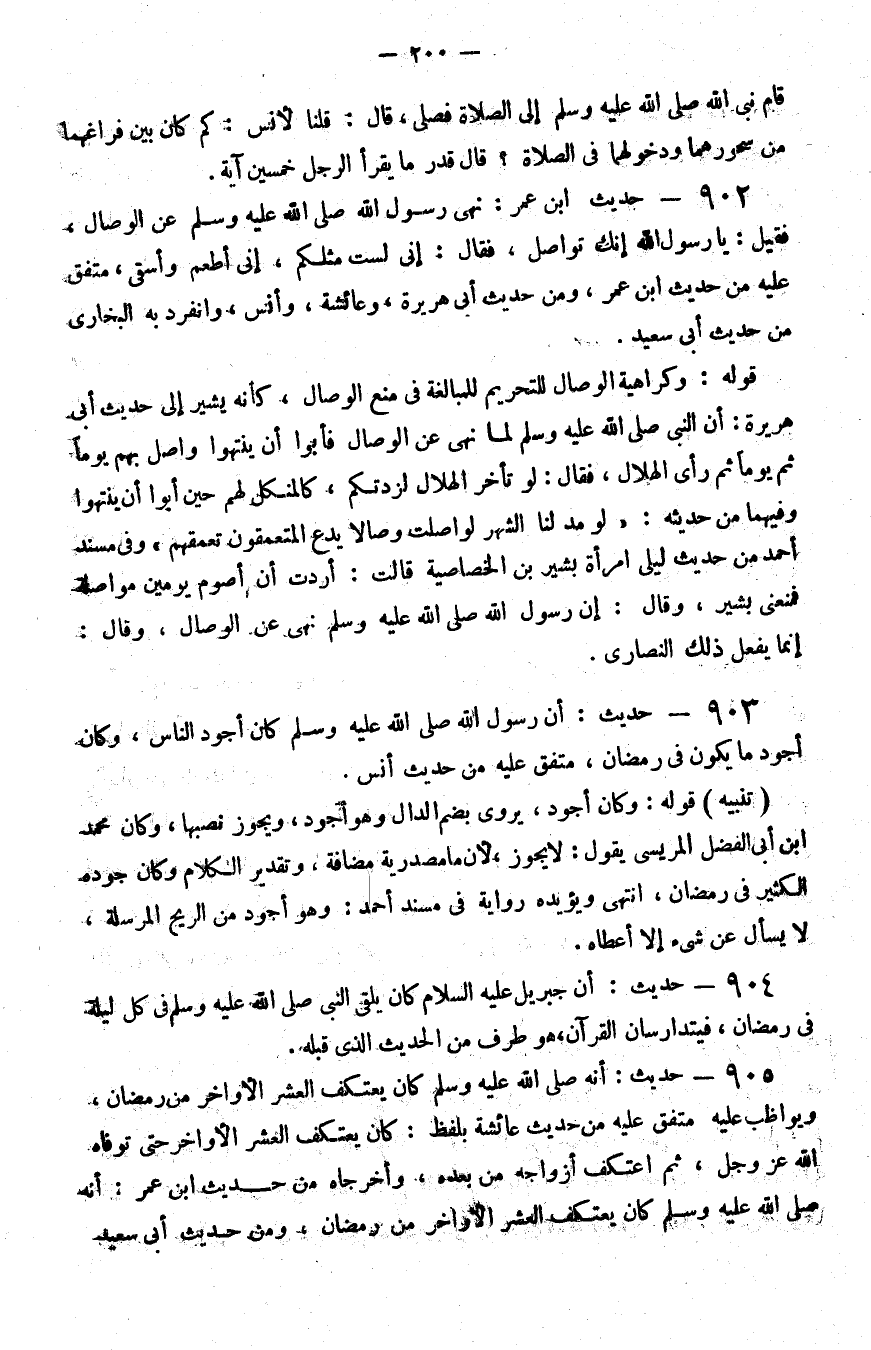 905 - حديث أنه صلى الله عليه و سلم كان يعتكف العشر الأواخر من رمضان ويواظب عليه متفق عليه من حديث عائشة بلفظ كان يعتكف العشر الأواخر حتى توفاه الله عز و جل ثم اعتكف أزواجه من بعده وأخرجاه من حديث بن عمر أنه صلى الله عليه و سلم كان يعتكف العشر الأواخر من رمضان ومن حديث أبي سعيد
