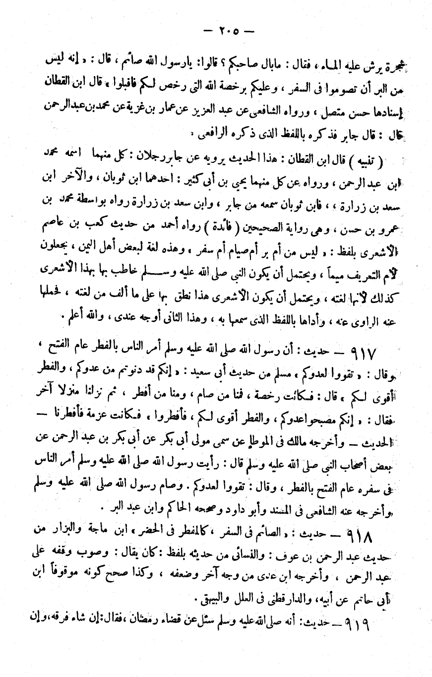 917 - حديث أن رسول الله صلى الله عليه و سلم أمر الناس بالفطر عام الفتح وقال تقووا لعدوكم مسلم من حديث أبي سعيد إنكم قد دنوتم من عدوكم والفطر أقوى لكم قال فكانت رخصة فمنا من صام ومنا من أفطر ثم نزلنا منزلا آخر فقال إنكم مصبحوا عدوكم والفطر أقوى لكم فأفطروا فكانت عزمة فأفطرنا الحديث وأخرجه مالك في الموطأ عن سمي مولى أبي بكر عن أبي بكر بن عبد الرحمن عن بعض أصحاب النبي صلى الله عليه و سلم قال رأيت رسول الله صلى الله عليه و سلم أمر الناس في سفره عام الفتح بالفطر وقال تقووا لعدوكم وصام رسول الله صلى الله عليه و سلم وأخرجه عنه الشافعي في المسند وأبو داود وصححه الحاكم وابن عبد البر