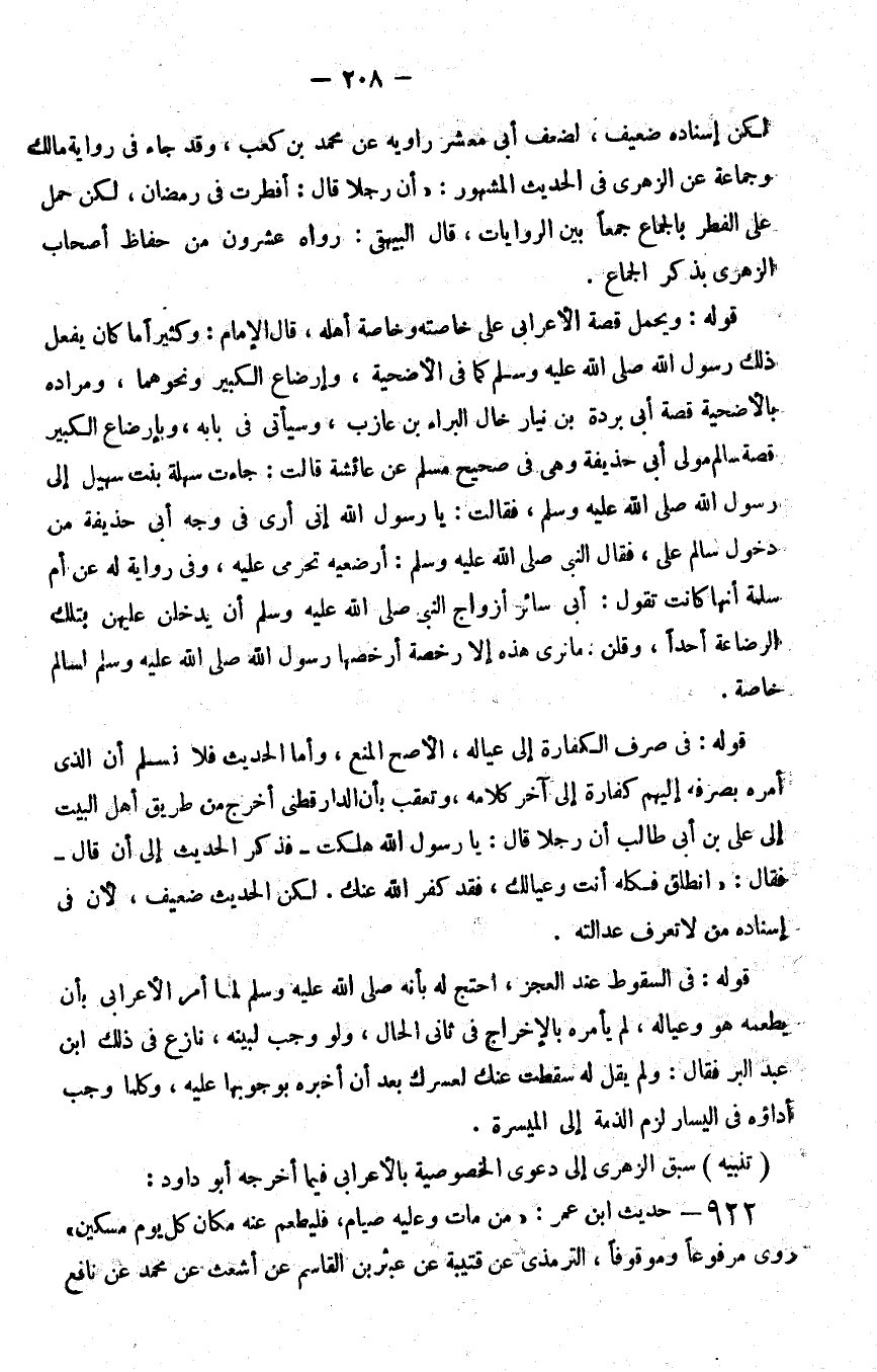 لكن إسناده ضعيف لضعف أبي معشر راويه عن محمد بن كعب وقد جاء في رواية مالك وجماعة عن الزهري في الحديث المشهور أن رجلا قال أفطرت في رمضان لكن حمل على الفطر بالجماع جمعا بين الروايات قال البيهقي رواه عشرون من حفاظ أصحاب الزهري بذكر الجماع